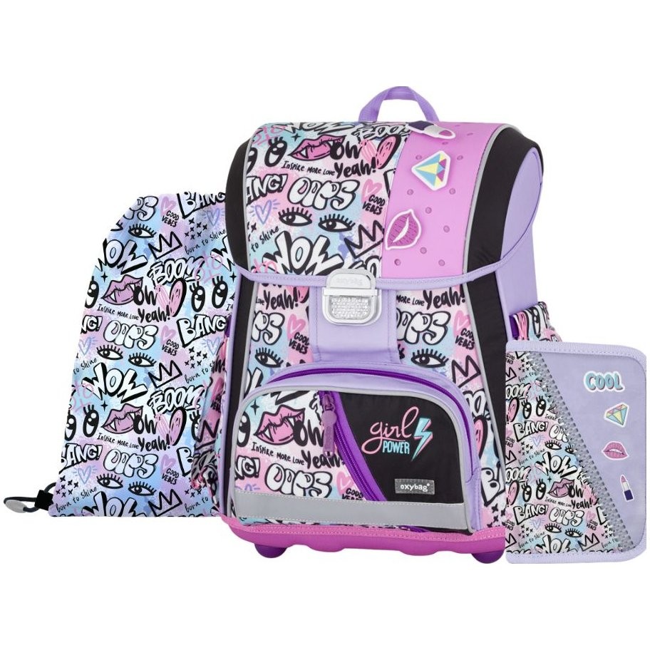 Aktatáska: A prémium iskolatáska anatómiailag formált, hogy biztosítsa a megfelelő illeszkedést a háton. A megerősített hátrész és a belső megerősítés megőrzi a hátizsák formáját. A párnázás kellemes, légáteresztő anyagból készült, a széles, puha pántok pedig tökéletesen illeszkednek és egyenletesen terhelik a gyermek vállát. Az aktatáska egy tágas rekeszből áll, amelyben kényelmesen elférnek az 1. és 2. osztályos gyermekek minden iskolai felszerelése. A hátizsák alja tömör anyagból készült, amely megvédi a tartalmát a felborulástól és a kiömléstől. Fényvisszaverő reflektorral ellátott biztonsági fémcsattal rögzíthető. Az elülső zseb uzsonnának való, és számos fényvisszaverő elem teszi a táskát jobban láthatóvá. Hátsó panel hossza: 33 cm. Űrtartalom: 27 l. Teherbírás: 8 kg. Táska: Praktikus táska tornacipőhöz vagy iskolai papucshoz. A húzózsinórok meghúzásával könnyen zárható. Tolltartó: Egyszintes iskolai tolltartó két fedéllel, töltőanyag nélkül. Gumihurkok íróeszközök rögzítésére. A belső fedélen átlátszó fólia található az órarend számára.