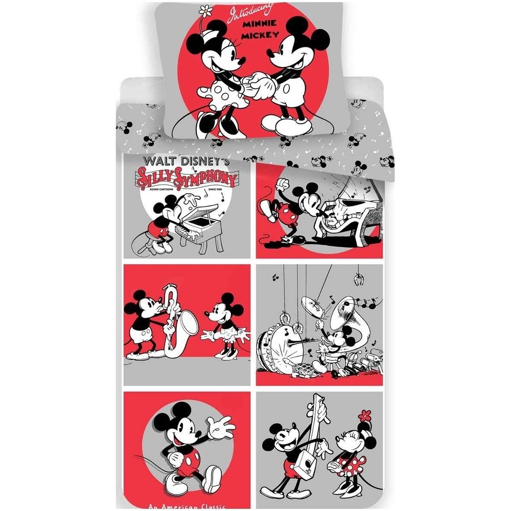 Kétoldalas gyermek pamut ágyneműhuzat Mickey és Minnie mesefigurájának képével. Az ágynemű mérete 140x200, 70x90 cm.
