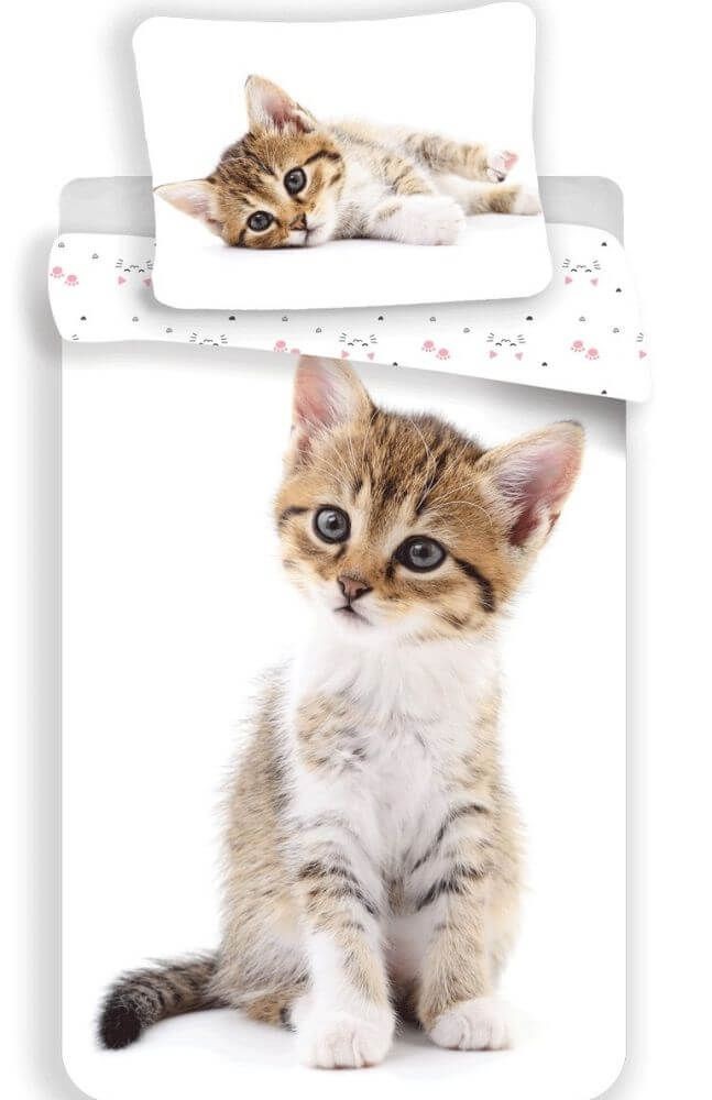 Kétoldalas gyerek ágynemű aranyos cica motívummal. Az ágynemű cipzáras és ágynemű mérete 140x200, párna 70x90 cm.