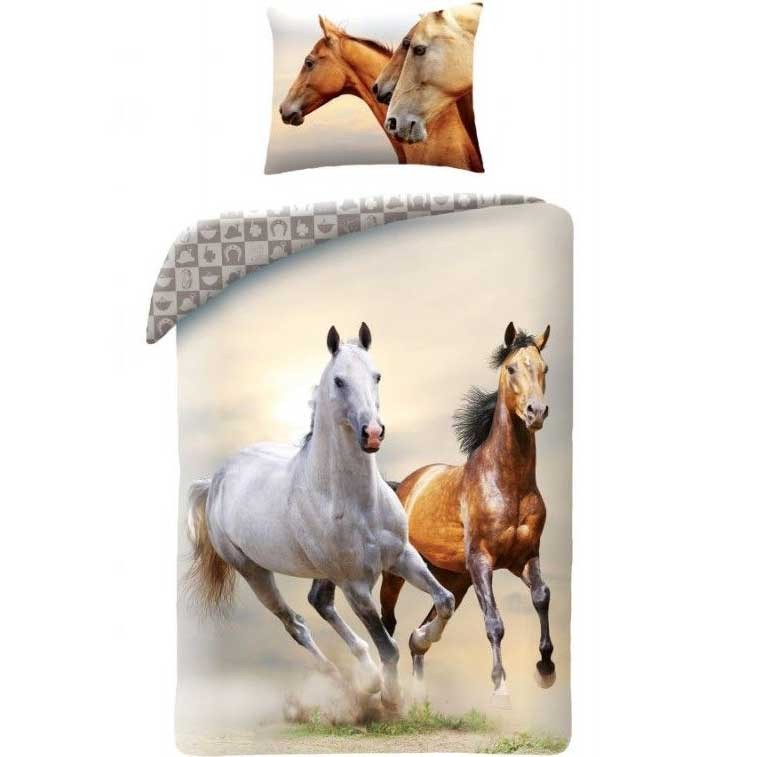 Minőségi ágynemű gyönyörű fehér és barna lovakkal elülső oldalán, az ágynemű másik oldala szürke és fehér színű, lovaglófelszerelés nyomattal. Cipzáros záródás. Az Öko-Tex 100 szabvány szerint készült.
