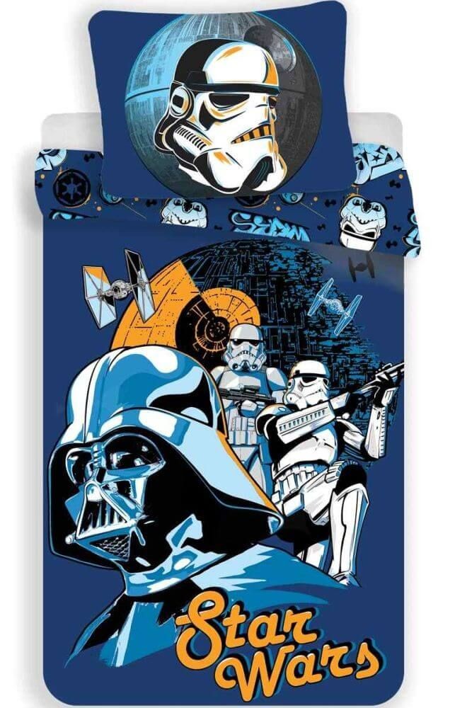 Kék ágyneműhuzat a Star Wars rajongóinak. Kétrészes ágynemű garnitúra 1 db 140 x 200 cm-es paplanhuzatot és 1 db 70 x 90 cm-es párnahuzatot tartalmaz. A cipzáras huzatok mindkét oldala színes/mintás, két oldalukon eltérő minták láthatók. A 100%-os pamut anyag nem csak kellemes tapintású, de különleges mintái a hálószoba egyedi dekorációjává is válhatnak.