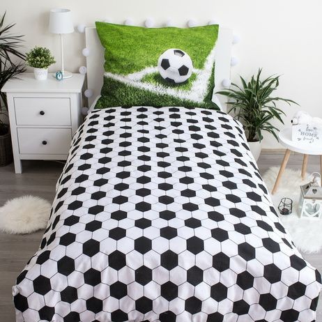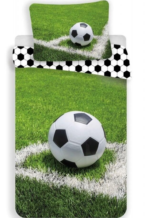 Zöld pamut ágynemű foci motívummal. A rögzítés cipzárral történik. A lapok kétoldalasak, 140 x 200 és 70 x 90 cm méretűek.