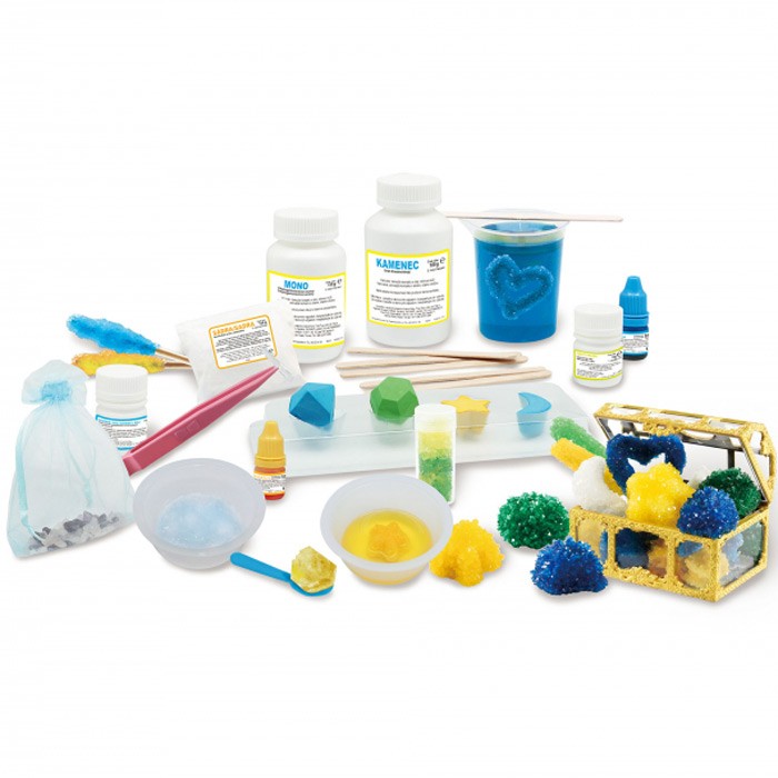 A készlet tartalma: timsó 180 g, mono (ammónium-dihidrogén-foszfát) 110 g, keserű sók 20 g, fénypor 3 g, gipsz 125 g, sárga folyékony festék 5 ml, kék folyékony festék 5 ml, , kanál, műanyag tálak, átlátszó műanyag ampulla fedővel, habszivacs tartóval, zacskó féldrágakővel, horgászzsinórral, pipatisztítóval, persely és gipszforma.