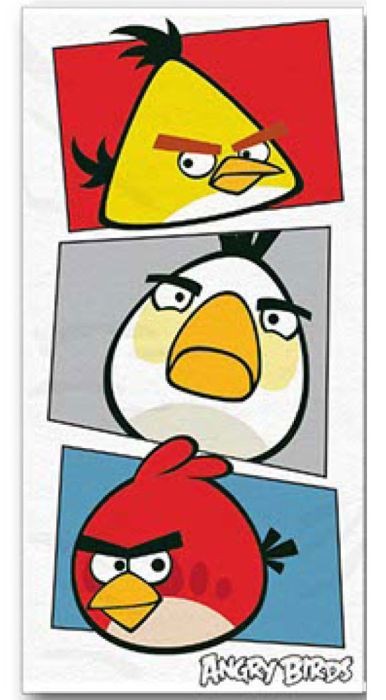Fürdőlepedő, strand törölköző Angry Birds motívummal, mérete 70 x 140 cm. A fürdőszobában vagy a medencében is lehet használni. Anyag összetétele: 100% pamut