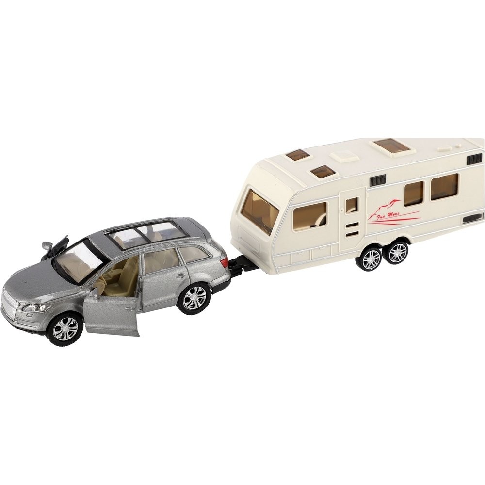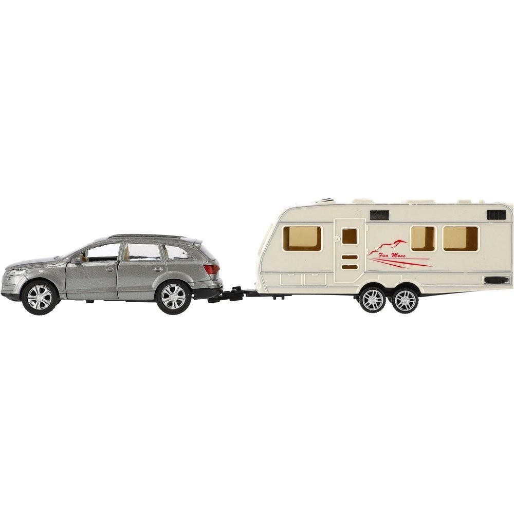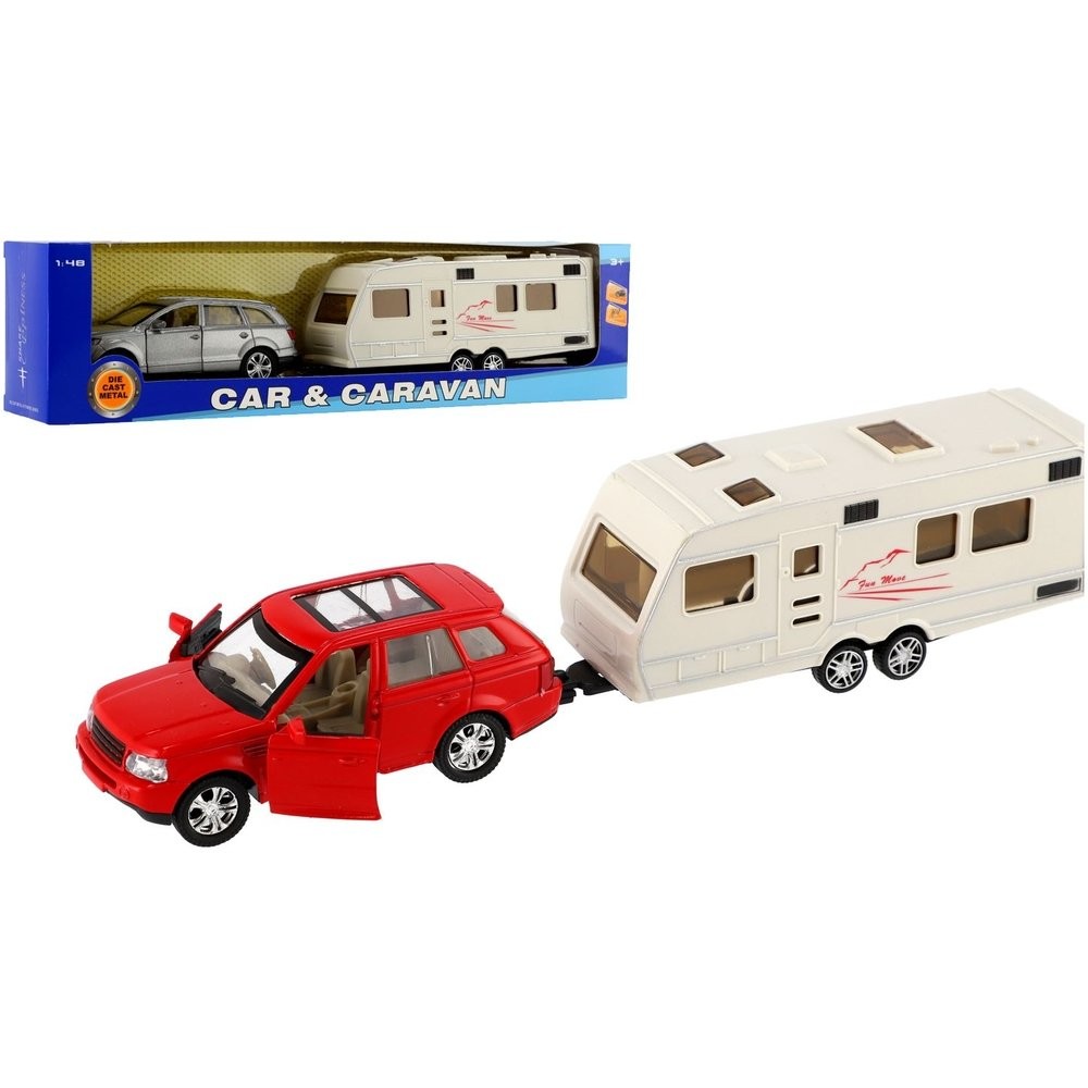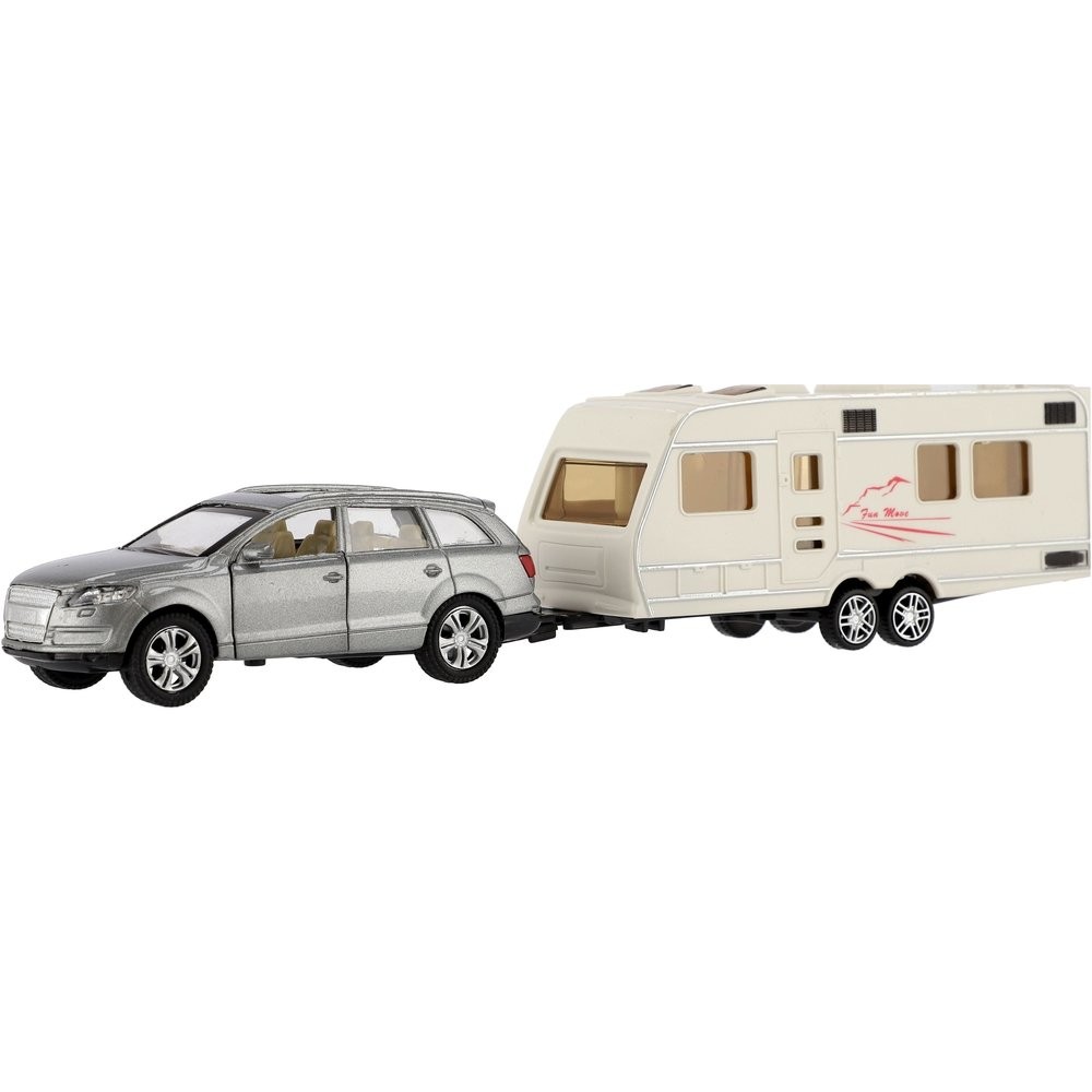 Gyönyörű modell autó lakókocsival. Az autó nyitható ajtós, hátramenetes és lakókocsihoz köthető, mellyel bárhová el lehet jutni. Hova mész idén nyaralni lakókocsival? Az autó mérete: 29 cm Doboz mérete: 32 x 8 x 6 cm 3 éves kortól alkalmas
