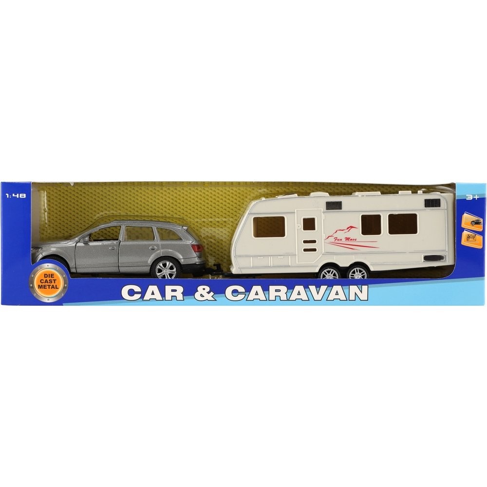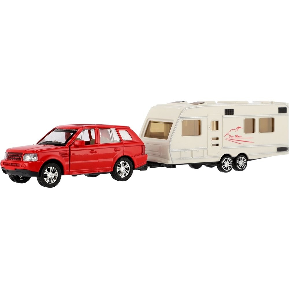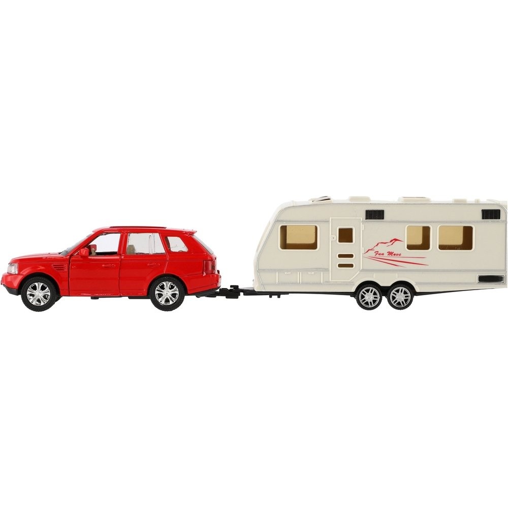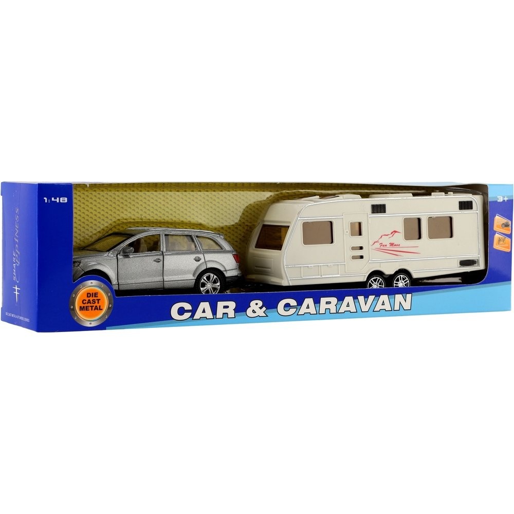 Gyönyörű modell autó lakókocsival. Az autó nyitható ajtós, hátramenetes és lakókocsihoz köthető, mellyel bárhová el lehet jutni. Hova mész idén nyaralni lakókocsival? Az autó mérete: 29 cm Doboz mérete: 32 x 8 x 6 cm 3 éves kortól alkalmas