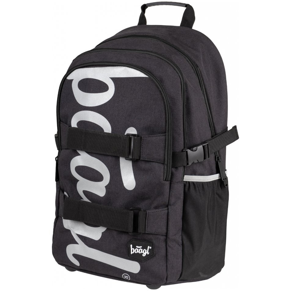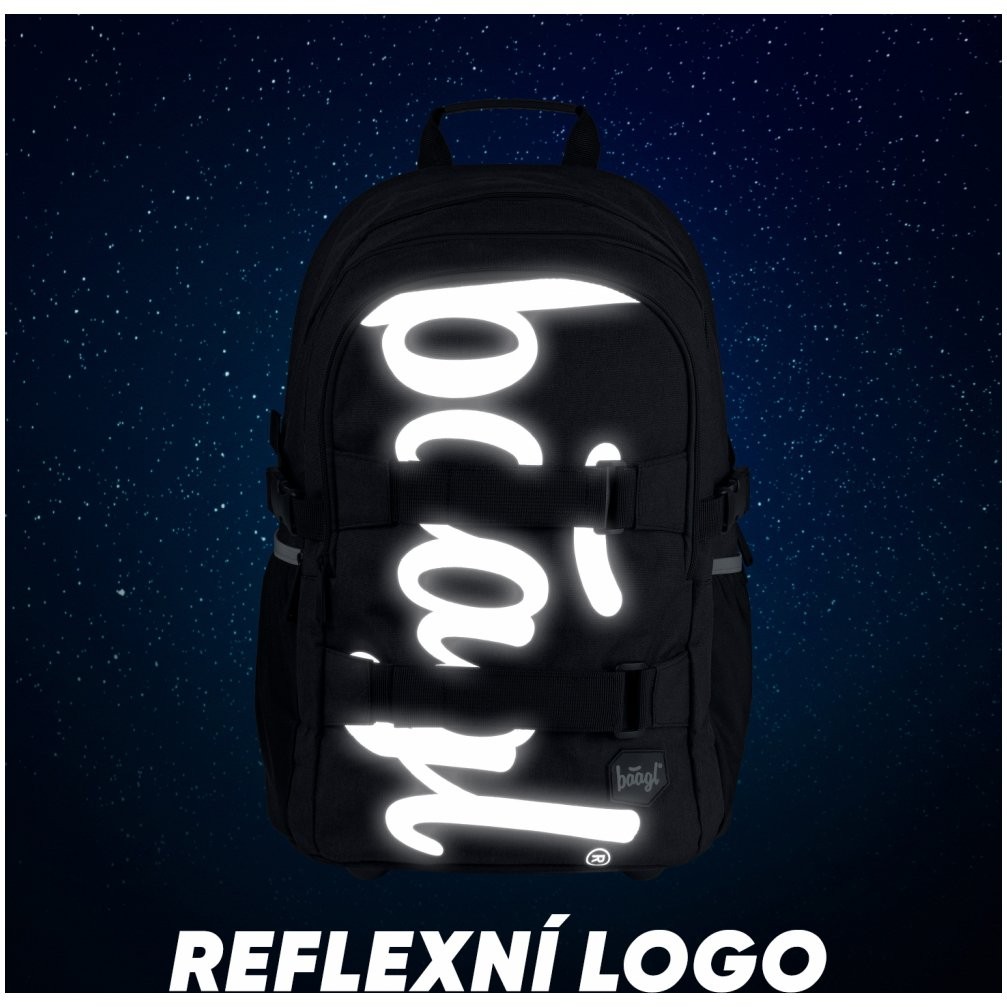 Skate Black iskolai hátizsák, fényvisszaverő Baagl logóval az elején, az általános iskola 1. osztályának 3. osztályától kezdve, valamint az általános iskola 2. osztályáig. A hátizsákot sikeresen tesztelték az ITC Zlínnél.