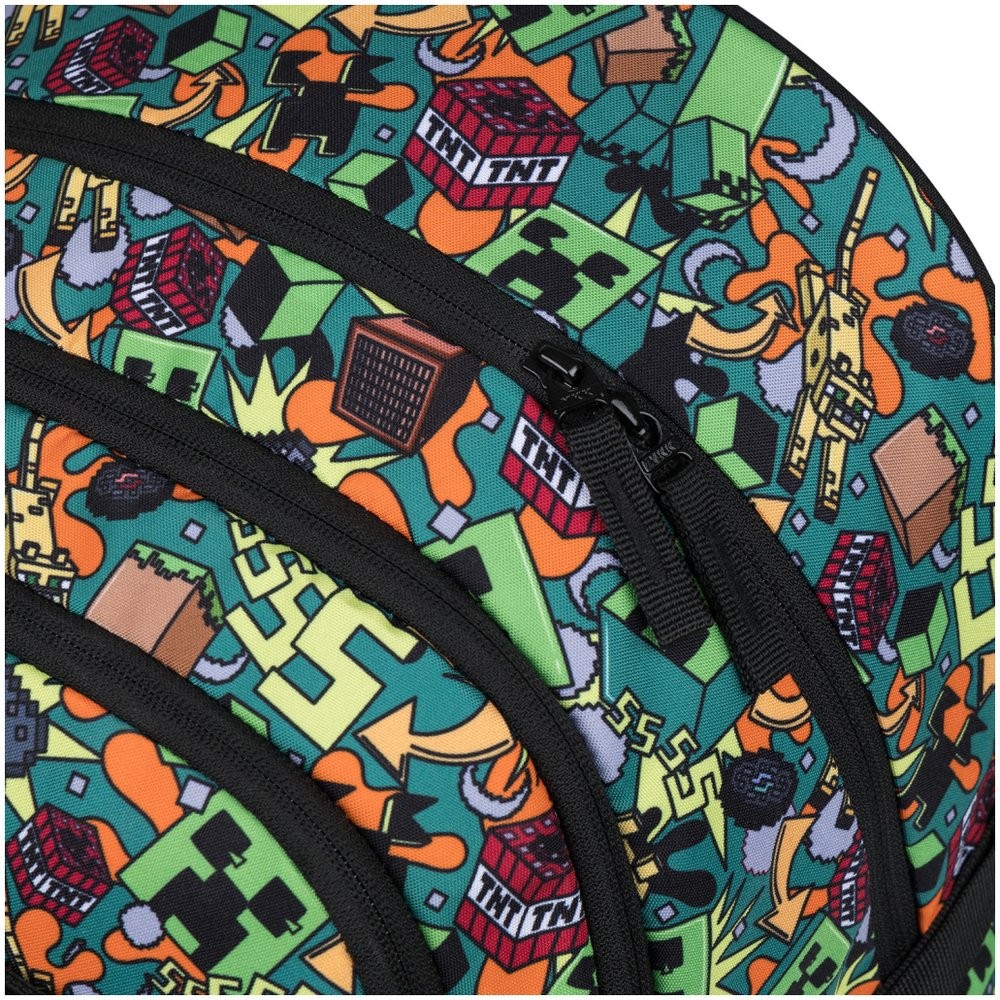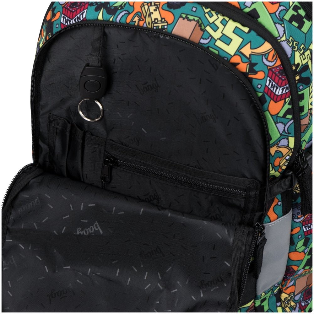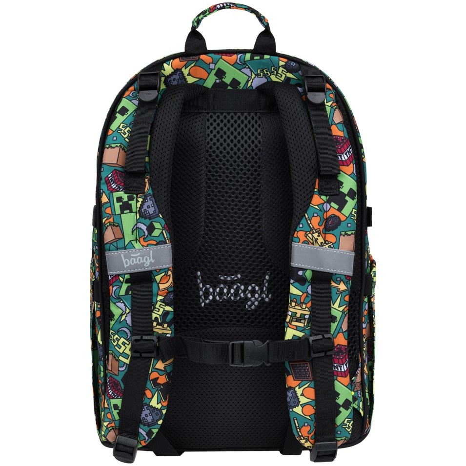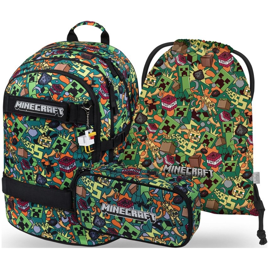 Iskolai hátizsák Baagl Skate Minecraft Chaos modell – a háromrészes szett tartalmaz egy hátizsákot, tolltartót és tornazsákot egységes mintával.