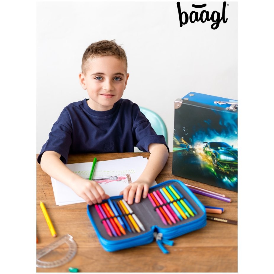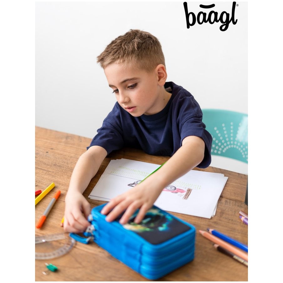 Baagl három emeletes tolltartó, írószerekhez. Erős ceruzákhotz és markerekhez igazított gumiszalagok. Megerősített hátlap a könnyebb kezelhetőség érdekében záráskor. Megbízható márkás YKK cipzárok. A tolltartó üres.