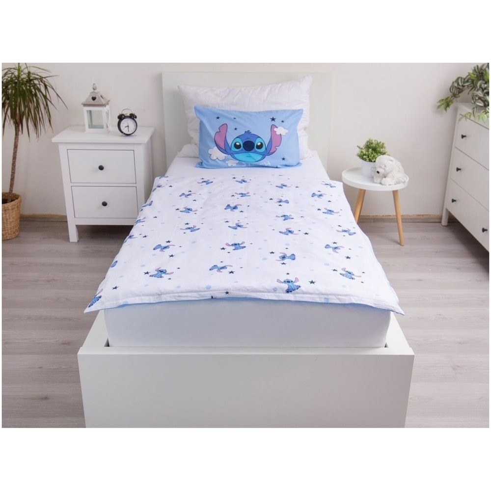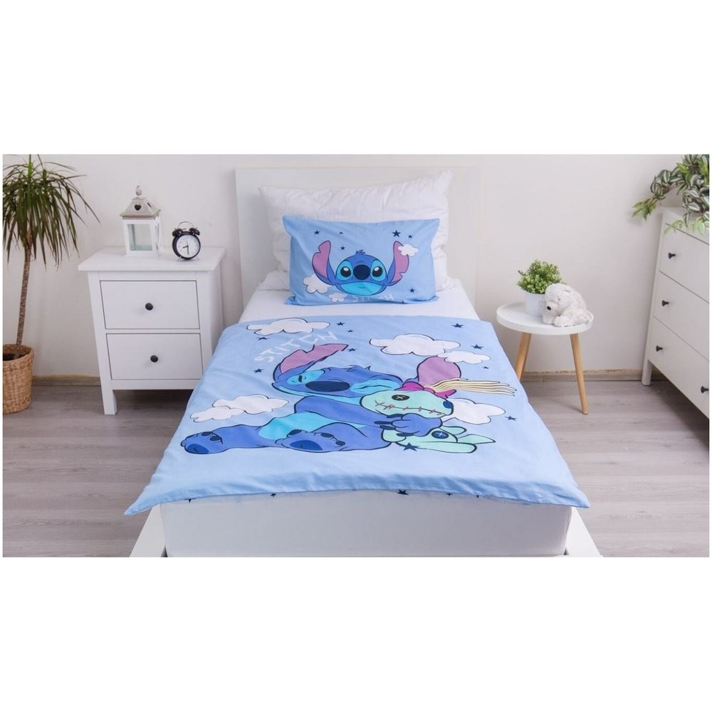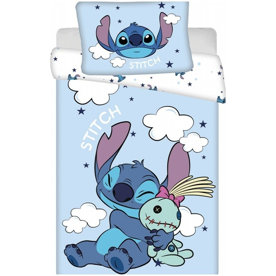 Baba ágyneműStitch Clouds baby, finom 100% pamutból. Méret: 100×135 cm + 40×60 cm, cipzáras záródással. Aranyos Stitch minta felhőkkel a nyugodt alváshoz!