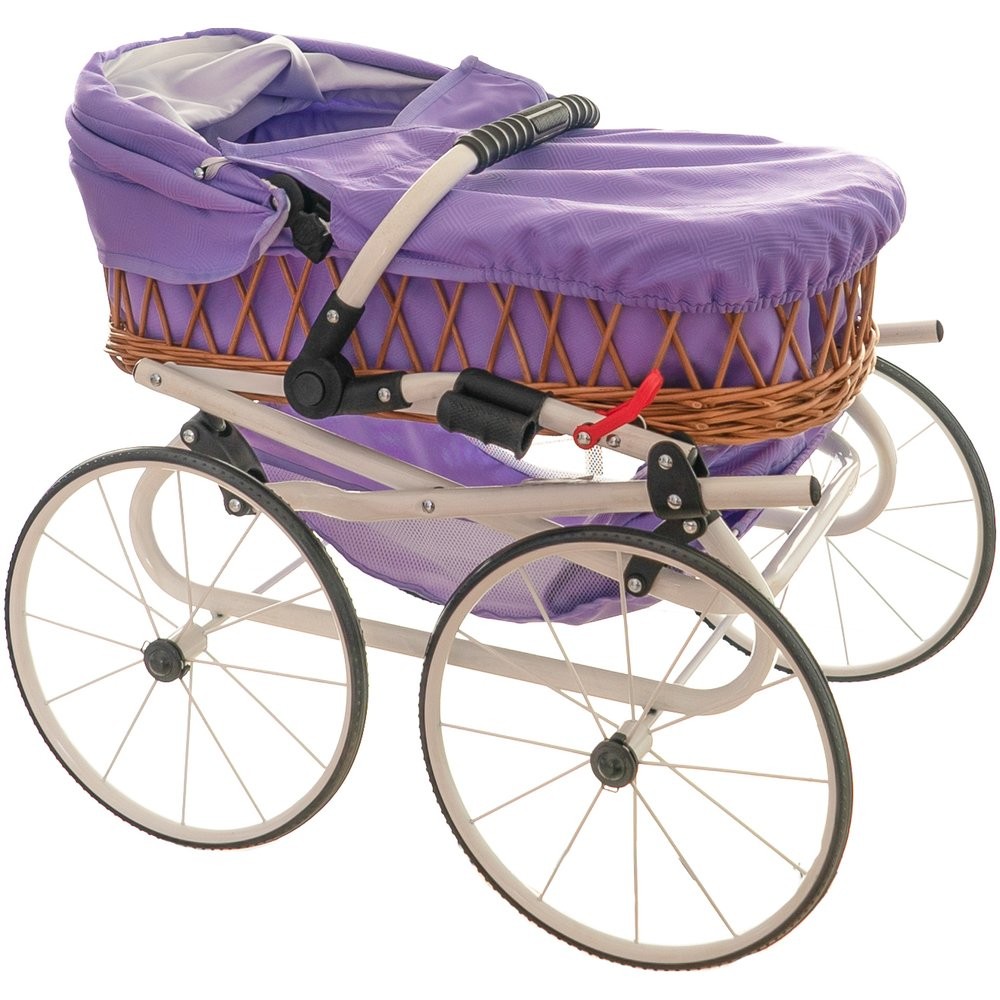 A lila, pöttyös babakocsi és a rattan ágy minden kislánynak tetszeni fog. A babakocsi teteje könnyen lehajtható. Tartalmaz egy táskát a fogantyú felett és egy praktikus kosarat a babakocsi alatt. Fogantyú magassága: 76 cm, állítható. 3 éves kortól alkalmas.