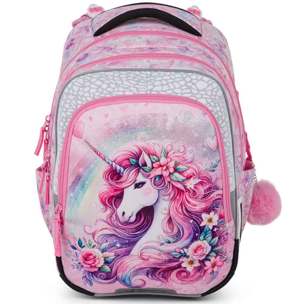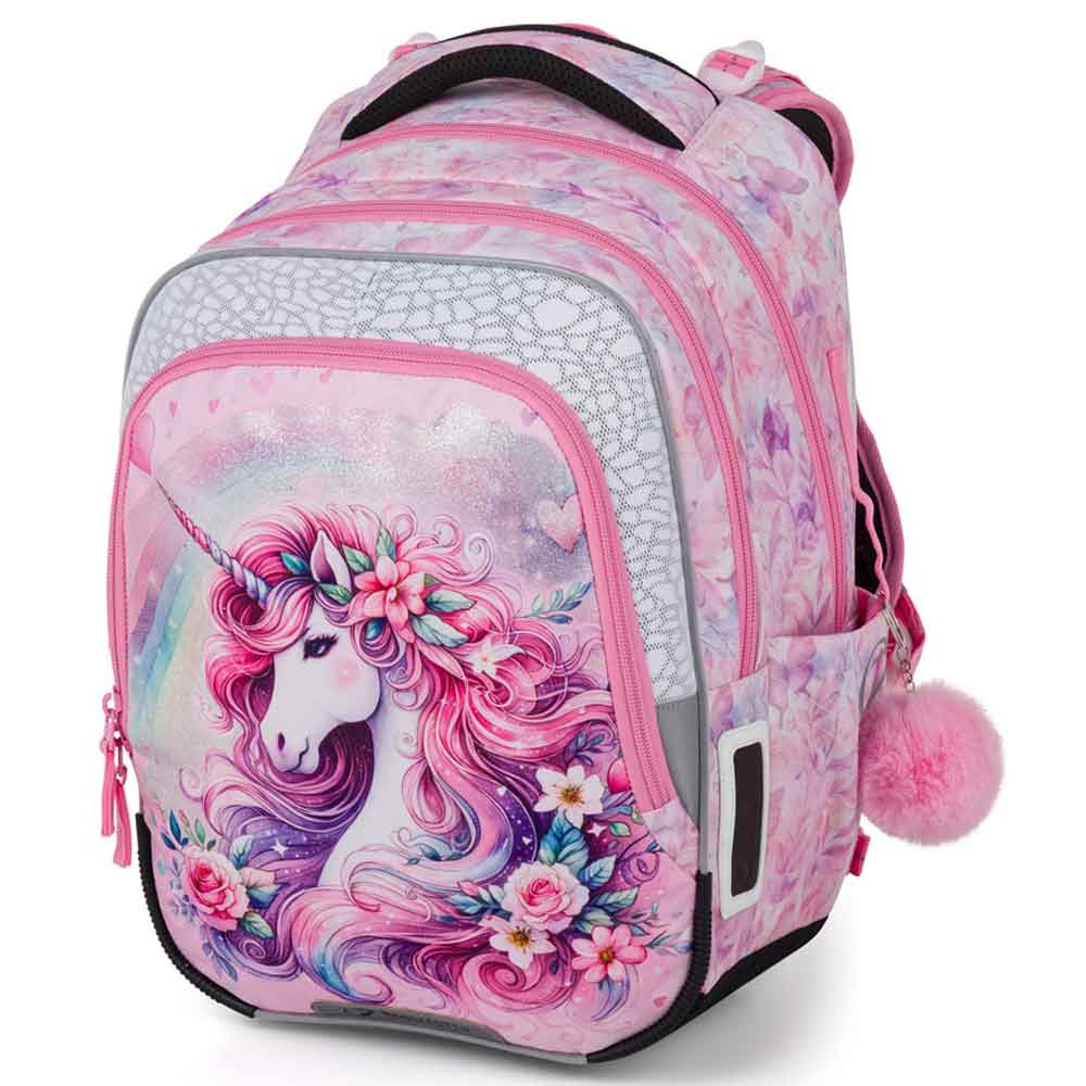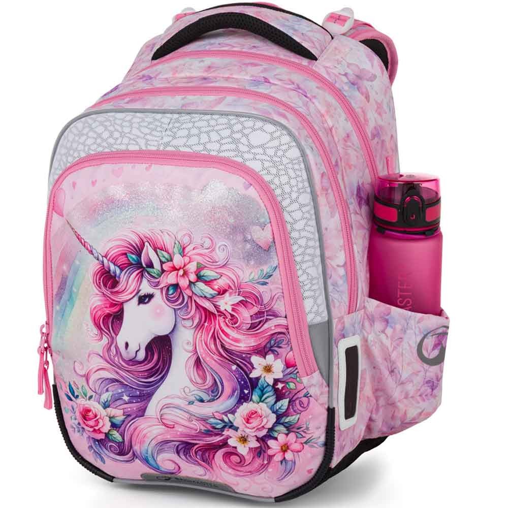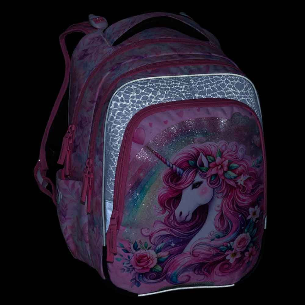 Iskolai táska elsősöknek unikornissal kislányoknak az 1–3. osztály számára. Súlya mindössze 0,94 kg, mégis nagyon tágas. Három fő rekesszel rendelkezik, és praktikus szervezőt tartalmaz mobil, pénztárca és egyéb apróságok számára. A táska műanyag lábakon áll, és sötétben fényvisszaverő elemek világítanak rajta. Az új hátrendszer könnyített, kivehető derékpánttal és állítható mellkaspánttal rendelkezik, egészségügyi minősítéssel.