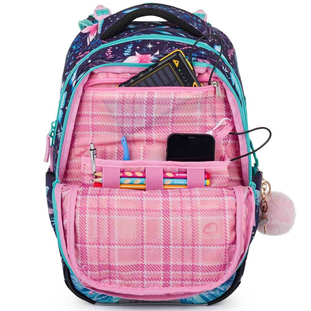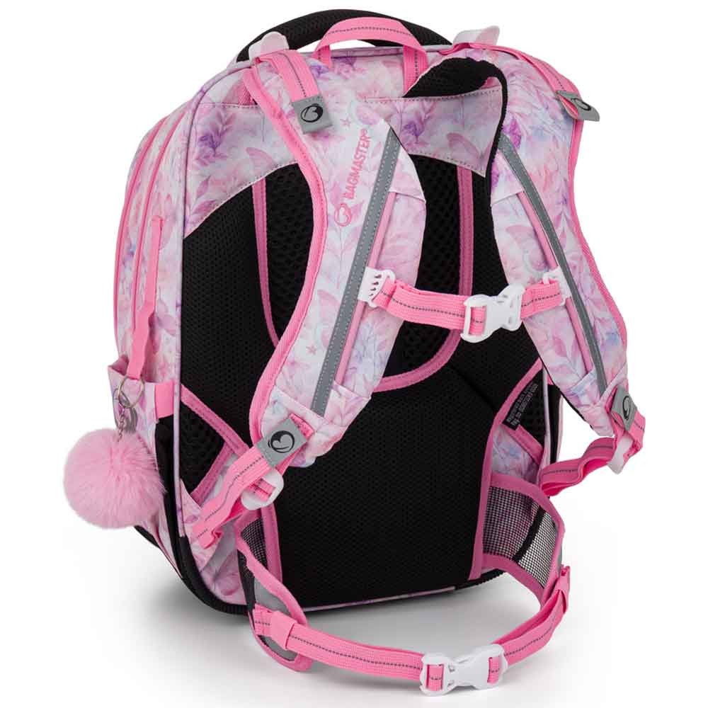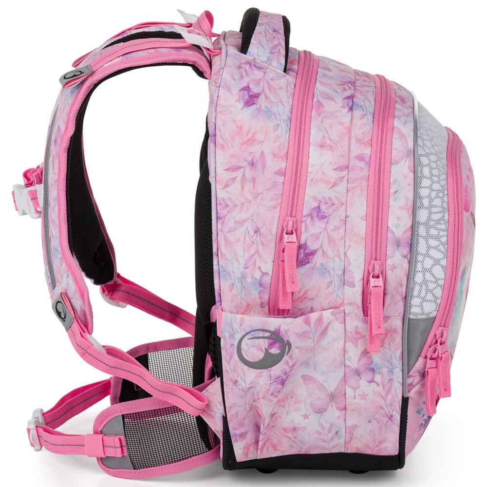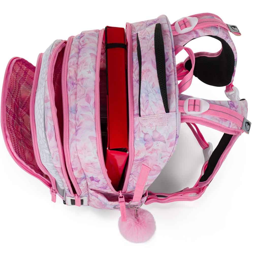 Iskolai táska elsősöknek unikornissal kislányoknak az 1–3. osztály számára. Súlya mindössze 0,94 kg, mégis nagyon tágas. Három fő rekesszel rendelkezik, és praktikus szervezőt tartalmaz mobil, pénztárca és egyéb apróságok számára. A táska műanyag lábakon áll, és sötétben fényvisszaverő elemek világítanak rajta. Az új hátrendszer könnyített, kivehető derékpánttal és állítható mellkaspánttal rendelkezik, egészségügyi minősítéssel.
