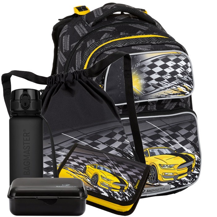 5 részes iskolatáska szett autós motívummal 1-3 osztályos fiúknak. A készlet tartalma: egy iskolatásks, tolltartó, tornazsák, kulacs és uzsonnás doboz.