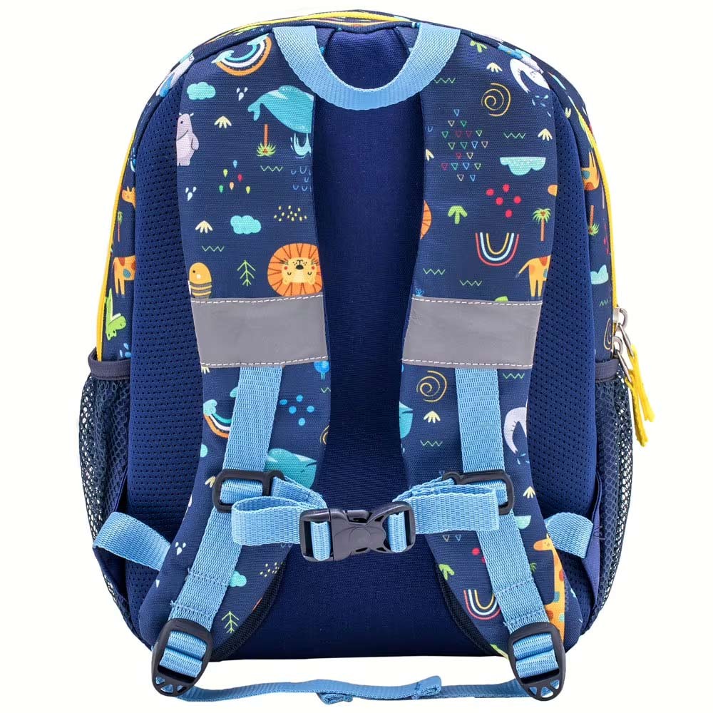 A hátizsáknak 2 rekesze van – a nagyobb rekesz bélésén nyomtatott névcímke található. Az oldalsó hálós zsebekbe akár 0,7 literes kulacs vagy esernyő is belefér. Fényvisszaverő elemek vannak a hátizsák elején és hátulján. A cipzárokat a gyerekek könnyen tudják kezelni. A hátizsák hordozófüle elég hosszú, hogy a szülők is kényelmesen vihessék.