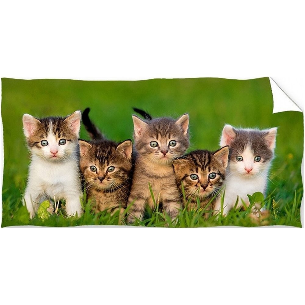 Gyermek strandtörölközőaranyos cicák motívumával a fűben. Minden macskabarátnak tetszeni fog.