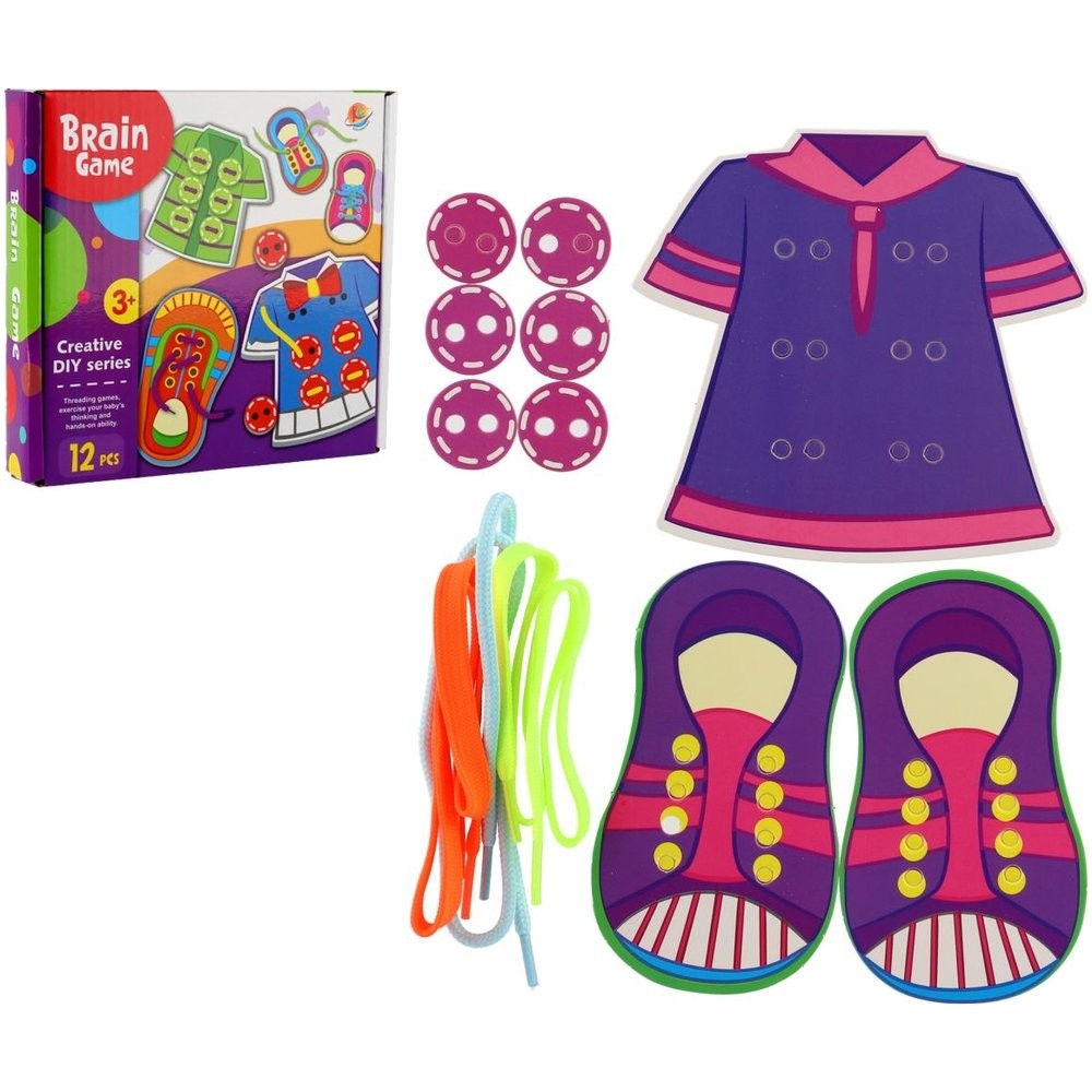 Gyakorold a gyerekekkel a cipőfűző bekötését és a cipőfűző lyukakon való áthúzását. Egy fűzőt/fűzőt, cipőt, inget/ruhát és tömör kartonból készült gombokat tartalmazó készlet segíthet. Doboz mérete: 18 x 16 x 3 cm 3 éves kortól használható