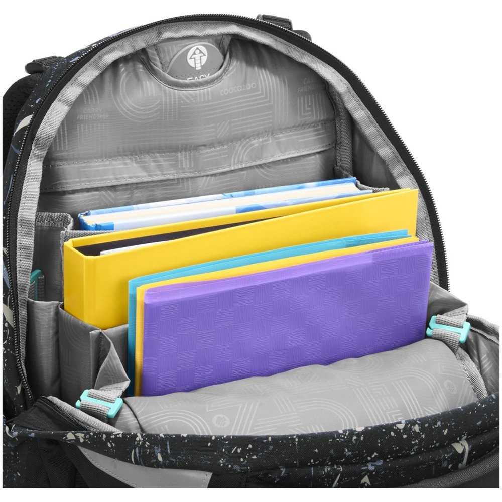 Nagy fő zseb könyves rekesszel és kivehető válaszfallal, zseb szervezővel és elülső zseb például uzsonnásdoboznak, lehetőség van a szervező tablethez rögzítésére a fő zsebben (külön megvásárolható), extra nagy hozzáférés a fő zsebhez a jobb áttekintés érdekében, stabil, tömör alj és félhomályban és sötétben.