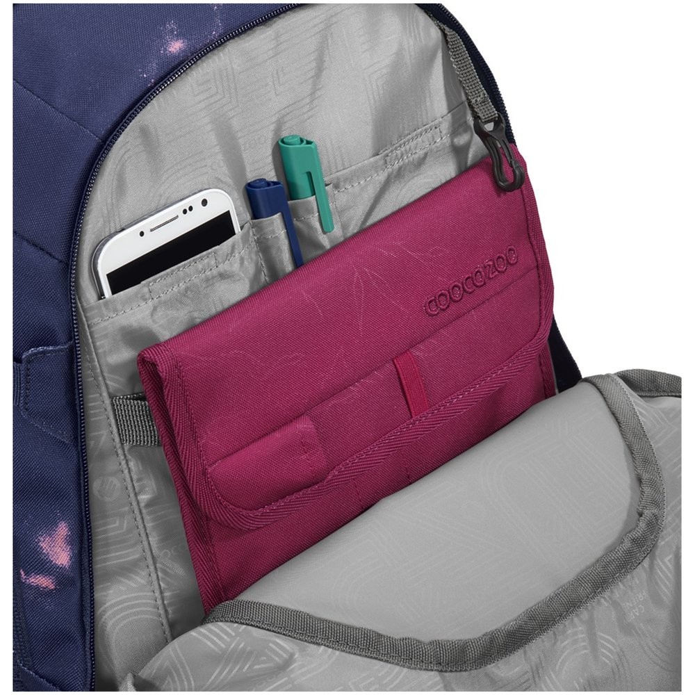 a hátizsák 4 zsebbel rendelkezik, 2 nagy főzseb elegendő helyet biztosít egy 15,6"-os laptop, könyvek és notebookok számára A4-es méretig, egy zseb iratrendezővel, írószer, egy karabiner a kulcsokhoz és egy tágas elülső zseb, pl. uzsonnás doboznak