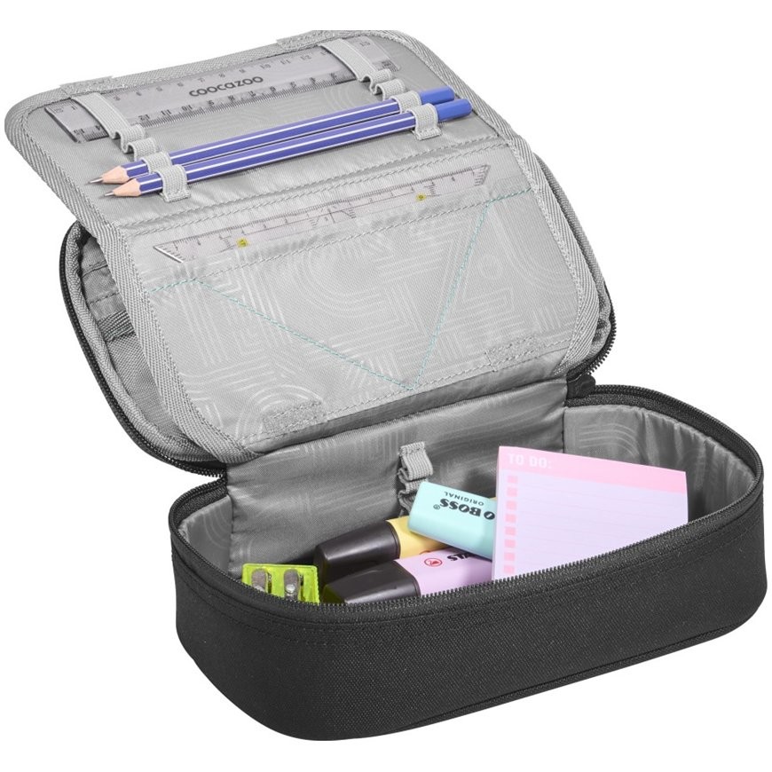 Az univerzális iskolai tolltartó cipzáras zsebbel rendelkezik a kis tárgyak tárolásához, valamint 6 toll- és ceruzatartóval a maximális rendezettség érdekében. További 7 nagyobb kapcsok további kiegészítők (pl. vonalzó, körző, radír, kis háromszög) tárolásához. Hely a napirendnek, hogy gyorsan áttekinthető legyen az iskolai nap, a belső zseb tépőzáras, a tolltartó cipzáras.