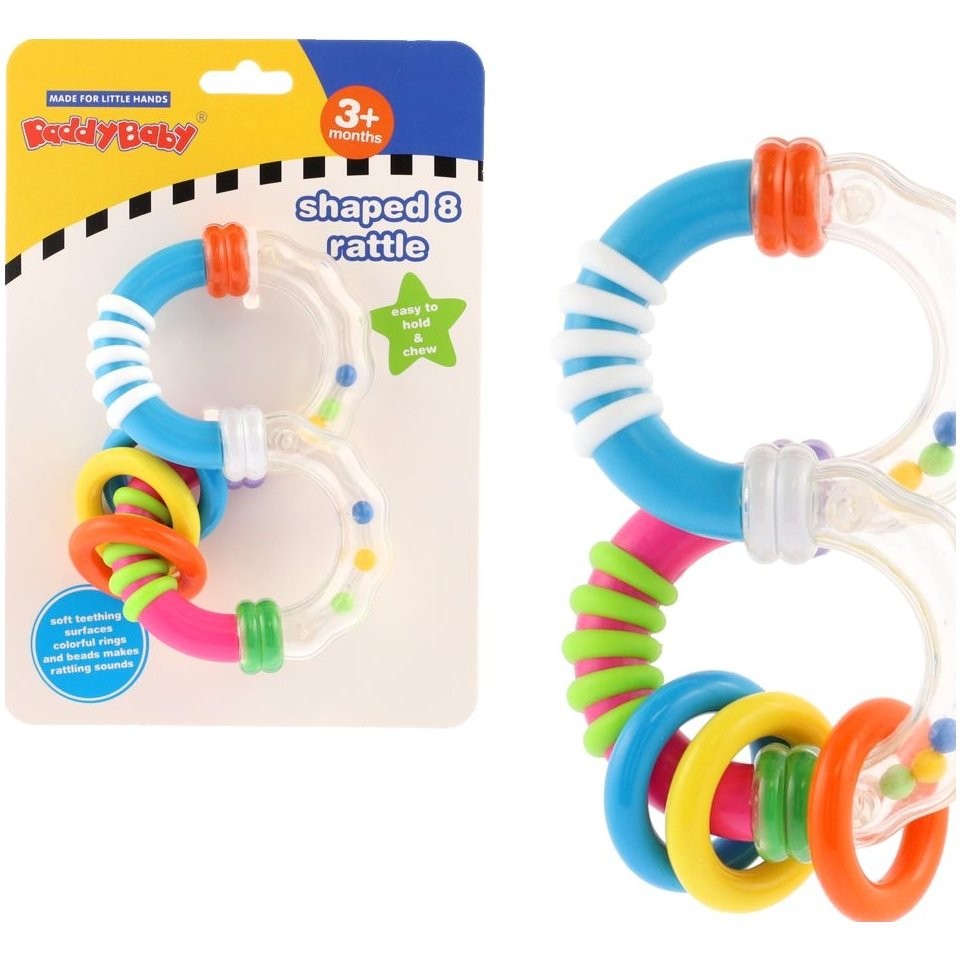 A nyolc alakú, vidám színekben pompázó csörgő minden kisgyermeket érdekelni fog.