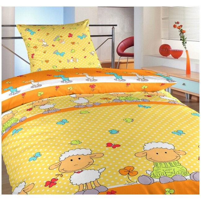 Sárga színű pamut ágynemű gyermekbirka motívummal. A lepedők fehér, sötétsárga, narancssárga, karamell vagy piros lepedővel kombinálhatók. A párna kis báránymintás.