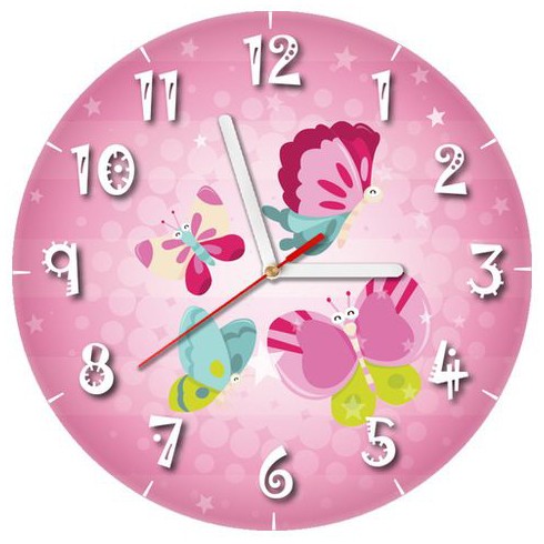 Pillangók motívummal ellátot lányi falióra rózsaszínre hangolva. A gyerekek számára készített órák eco-solvent nyomtatással vannak öntapadós fóliára nyomtatva, amely egy precízen kivágott PVC lapra van ragasztva. Ez a fajta nyomtatás nagyon időtálló és sokáig megőrzi az élénk színeket. A PVC hablap kemény és sima felülettel rendelkezik, amely mentes az apró felületi hibáktól, ezáltal ideális anyaga van az öntapadós fólia felragasztásához.
