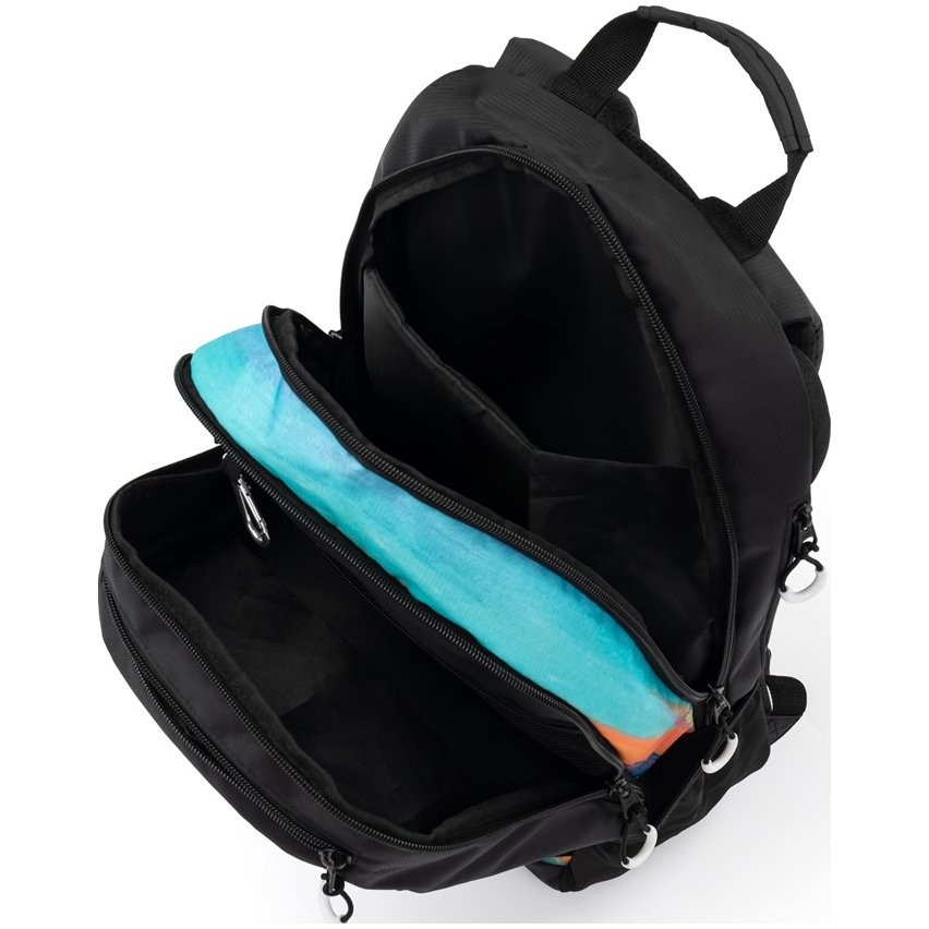 A iskolai hátizsák két fő rekeszből és egy kisebb elülső zsebből áll, erős cipzárral és praktikus hurkokkal. A hátizsák belsejében van egy megerősített zseb egy 15"-os laptop számára, egy karabiner a kulcsoknak, egy kisebb zseb az apróságoknak és egy rejtett zseb a hátoldalon.