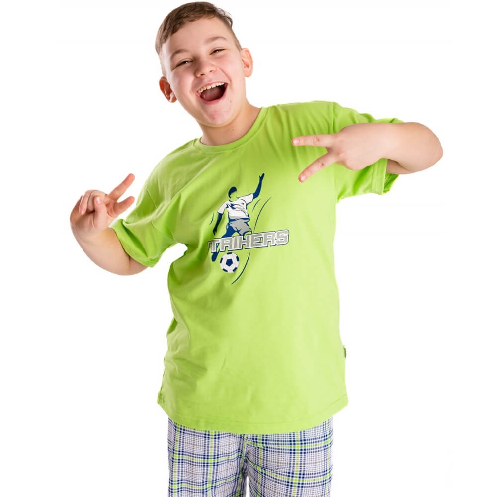 Egy fiú rövid ujjú pizsama póló eredeti nyomattal kiegészítve kényelmes rövidnadrággal. A kellemes pamut póló zöld színű. A rövidnadrág derekán gumiszalag van, amely szükség szerint cserélhető; négyzet alakú mintájúak.