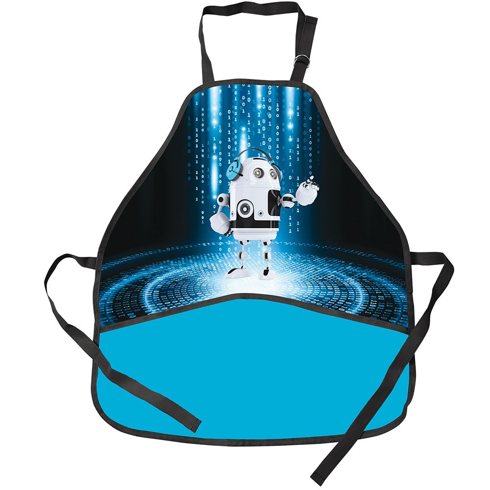 Mosható anyagból készült festő kötény művészeti oktatáshoz. A fejen állítható pánttal hordják, és zsinórral a test köré kötik. Az elején 2 zseb található a művészeti kellékeknek.