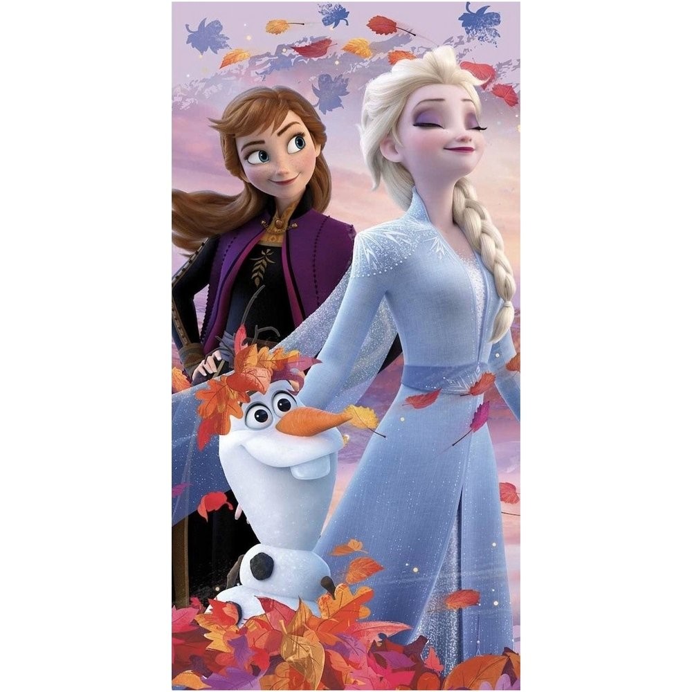 Gyermek strandtörölköző Annával, Elzával és Olaffal a Jégvarázsból. Kiváló minőségű nyomtatással, alkalmas a fürdőszobához és a strandhoz. A nyomtatás az egyik oldalon van, a másik oldal fehér. A törülköző kellemes frottír anyagból készül, jó nedvszívó képességgel.