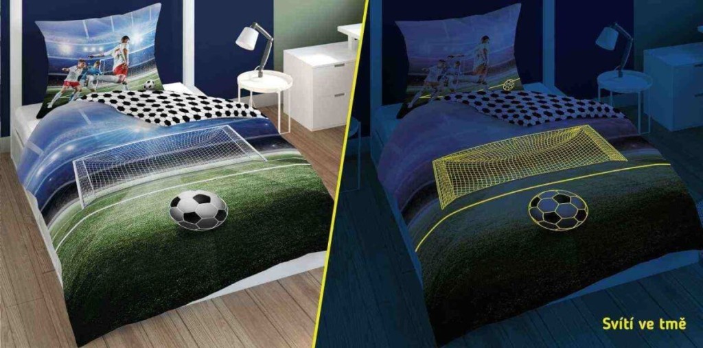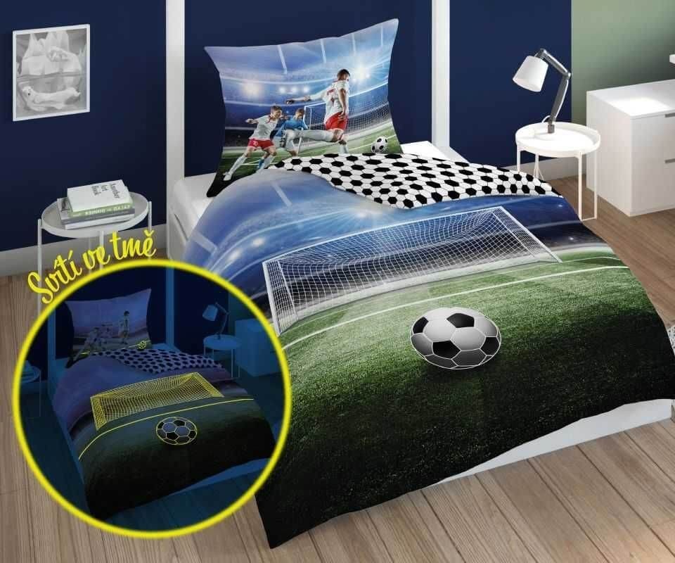 Pamut ágynemű focis motívummal. Az ágyneműhuzat mindkét oldala más és kényelmes cipzárral van felszerelve. Az ágynemű nappali megvilágítás után sötétben világít, a fényhatás 5 mosás után halványulhat, 40°C-on mosható.