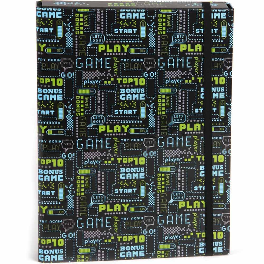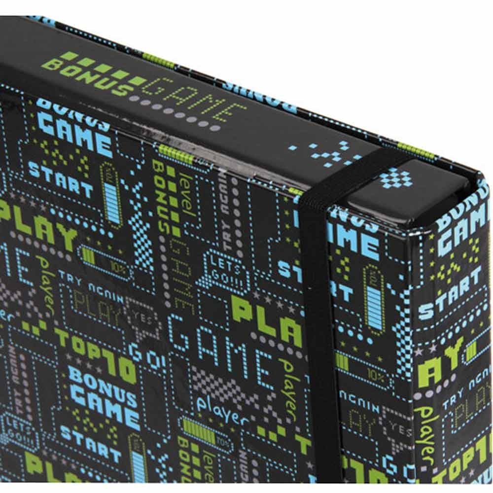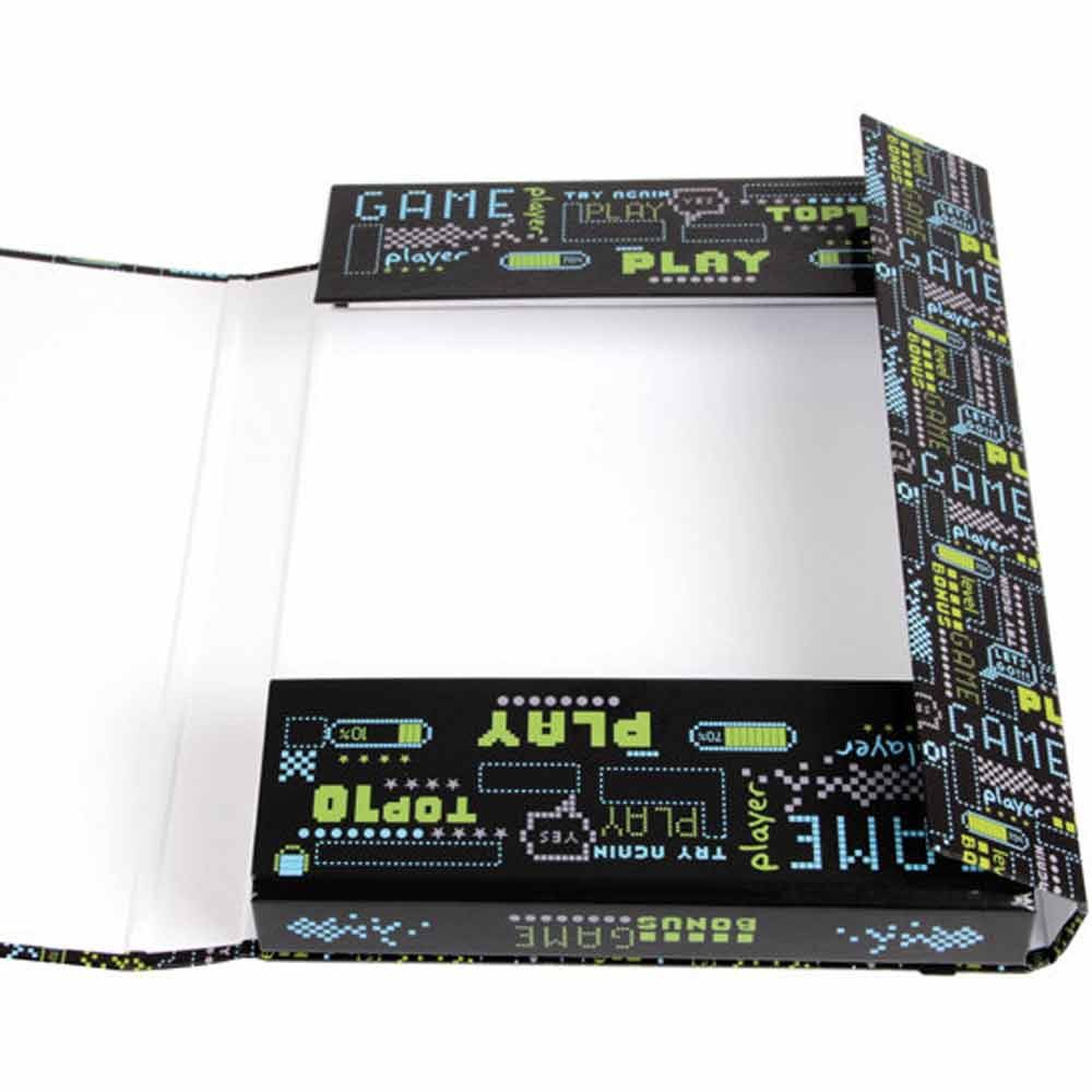 Füzetbox füzetek, rajzlapokhoz és egyéb iskolai felszerelésekhez A4-es formátumban, Game motívummal. A doboz laminált, és gumiszalag segítségével szorosan lezárható. Méret: 32 x 22,5 x 4,5 cm.