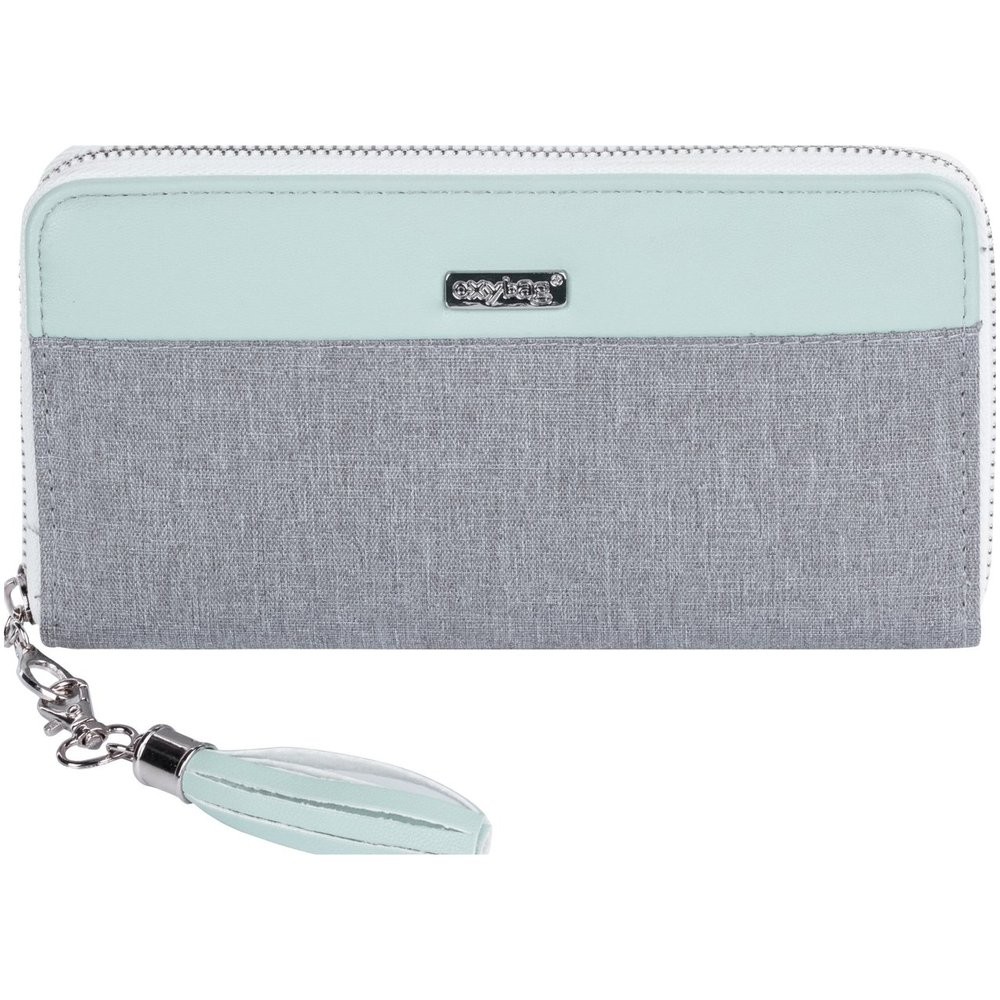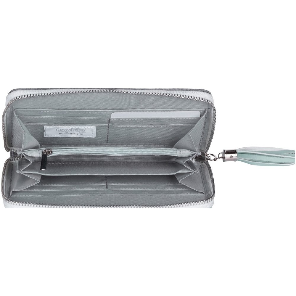 Nagy női pénztárca szürkészöld kivitelben. Belül található 8 kisebb zseb a hűségkártyák tárolására, 2 nagyobb zseb, 3 különálló rész a bankjegyek számára és 1 cipzárral zárható zseb az apró számára.