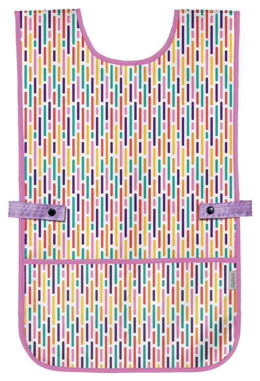 A gyermeknek nem kell a kötényt hátul megkötni, könnyen maga állíthatja be a derék körüli méretet, és a praktikus szabásnak köszönhetően a test nagyobb része védett.
