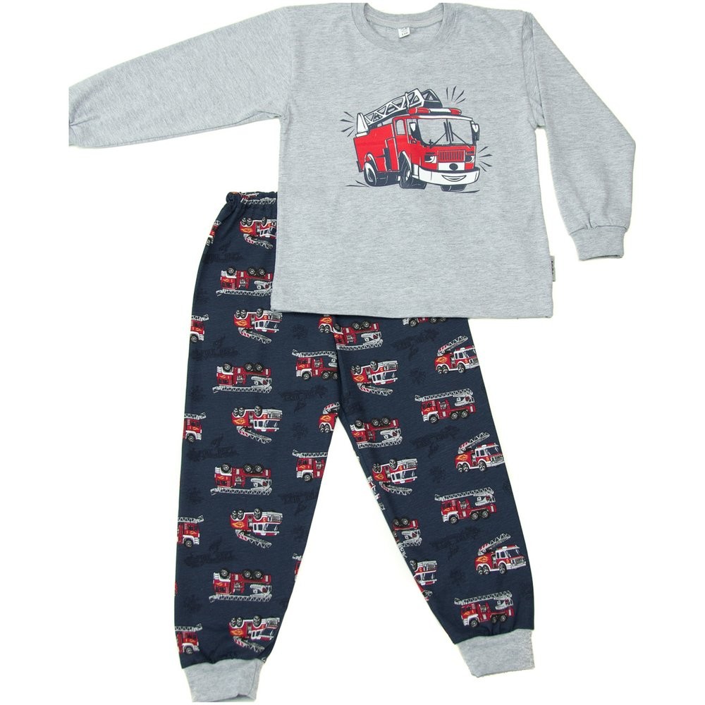 Pamut téli pizsamaaktív fiúknak. Sötétkék felső tűzoltóautó mintával, világosszürke nadrággal. A szürke felső része, nagy tűzoltóautó-mintával, nadrág egészíti ki játékautó-mintával. Mindez kellemes anyagból a nyugodt alvásért. Az ujjak és a lábak rugalmas, kényelmes mandzsettával vannak befejezve.