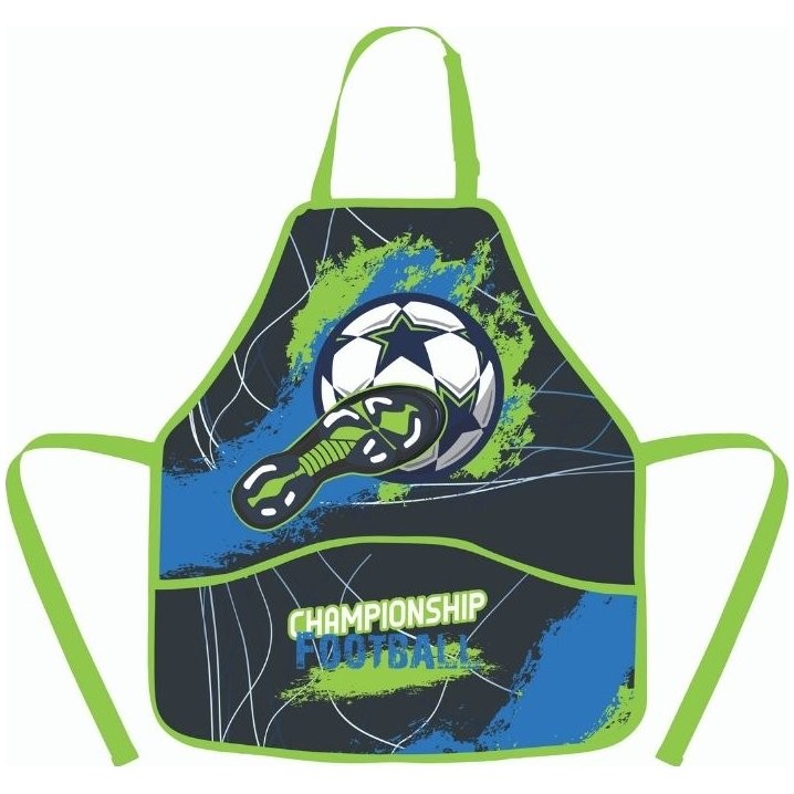 Futballmotívumú kötény művészeti oktatáshoz vagy más kreatív tevékenységhez. Rögzítés klipszel a nyak körül (hossza max. 50 cm), húzózsinór a deréknál (max. 80 cm). Elöl két tágas zseb. Anyaga 100% poliészter. Méretek: 52 x 44 cm