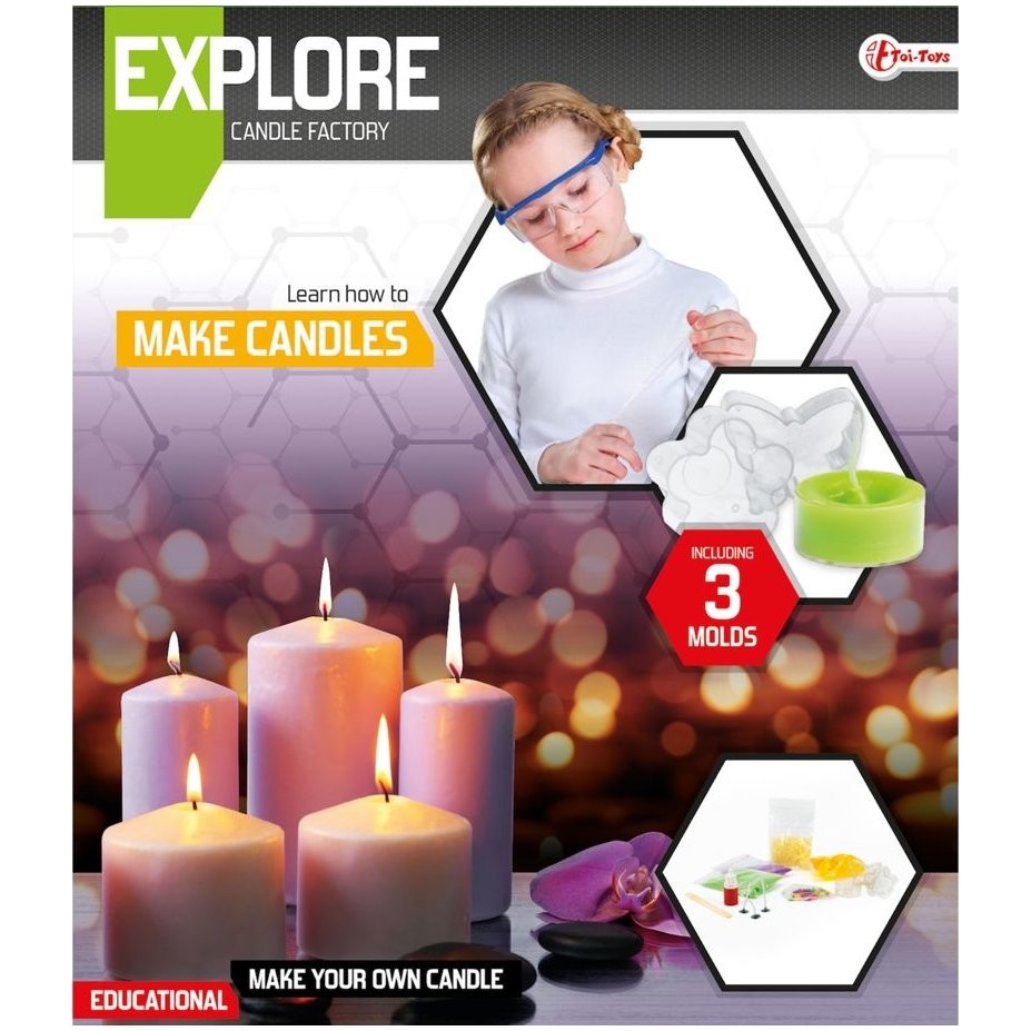 Készítsen saját gyertyát. Fejleszti a gyermekek fantáziáját és türelemre tanítja őket. A készlet tartalma: 3 darab forma, keverőpálca, 3 kanóc, gélviasz, paraffinviasz, 2 színes viasz, színes kövek, festék, képes útmutató. A csomag méretei: 27 x 31 x 5 cm. 8 évesnél idősebb gyermekek számára alkalmas.