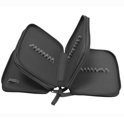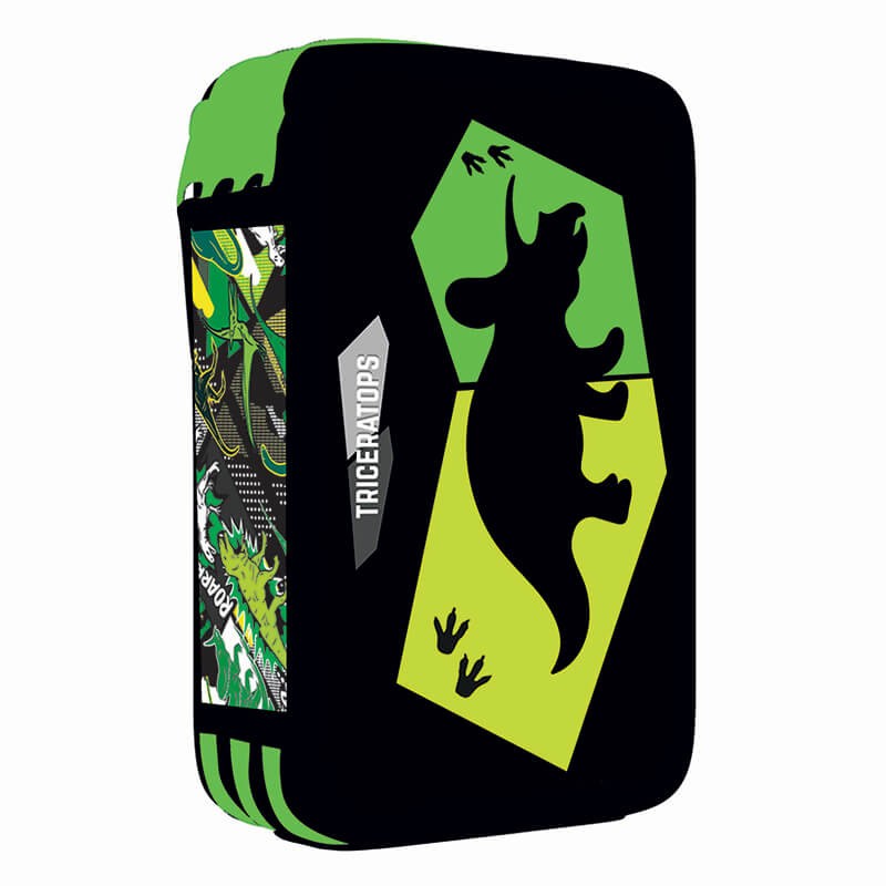 Kiváló minőségű háromszintes tolltartó, üres, dino motívummal. Gumis tartóiban 40 db írószer tárolható.