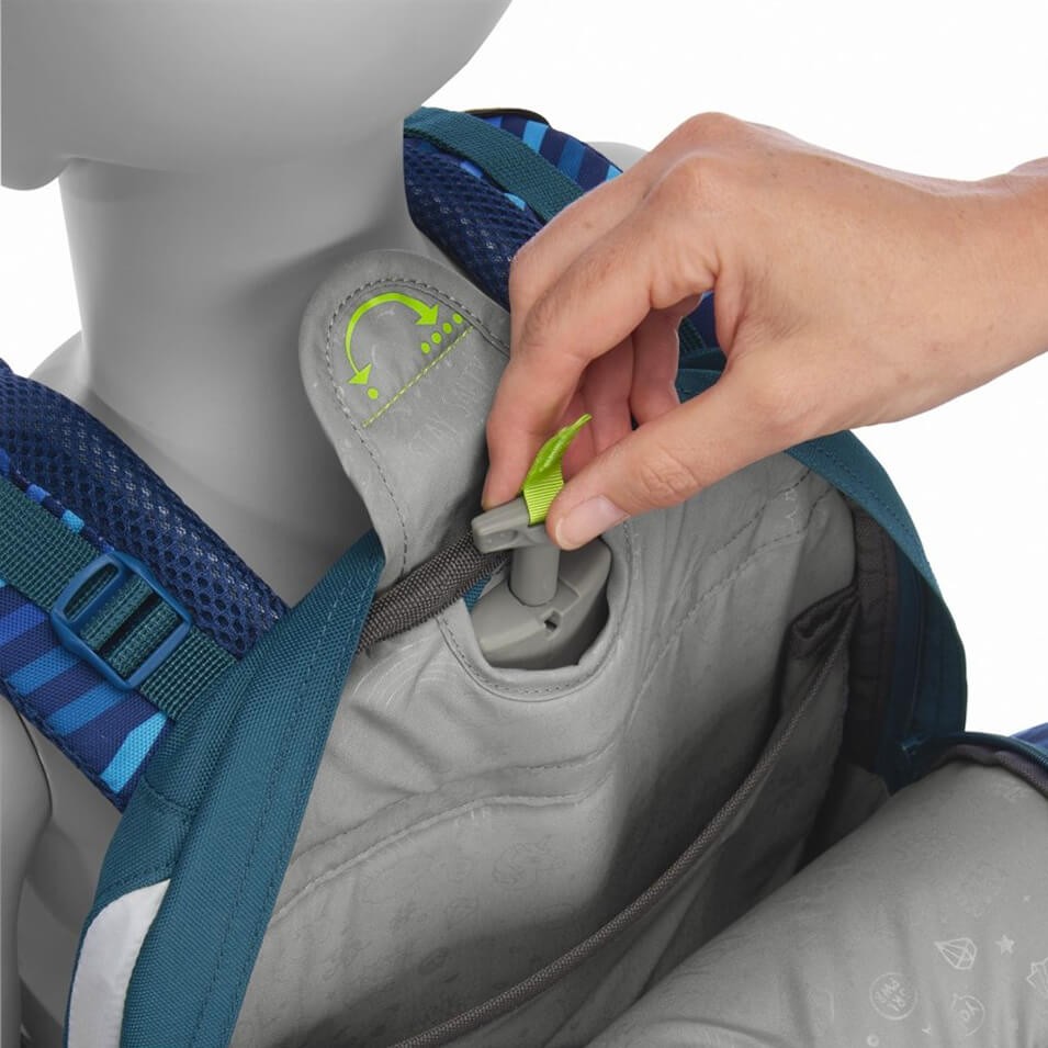 - lehetőség a vállpántok magasságának folyamatos beállítására a táska belsejében lévő forgó mechanizmusnak köszönhetően, biztosítsa a vállpántok pontos beállítását közvetlen a gyermek hátán (ergonómikus beállítás a hát méretének megfelelően)