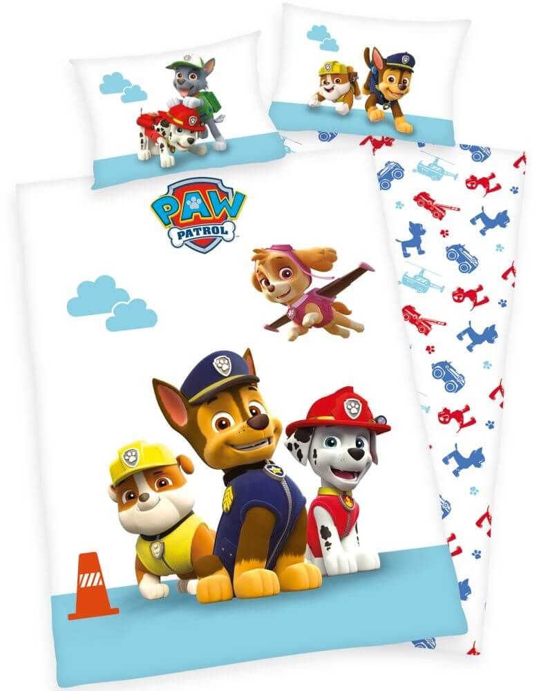 Kétoldalas baba ágyneműhuzat a népszerű Mancs őrjárat motívummal. A készlet tartalmaz 1x párnahuzatot 40x60 cm méretekkel és 1x takaróhuzatot 100x135 cm méretekkel. A takaró zárása cipzáras, a párnahuzat bujtatós. Anyaga: 100% pamut, Oko-Tex Standard 100