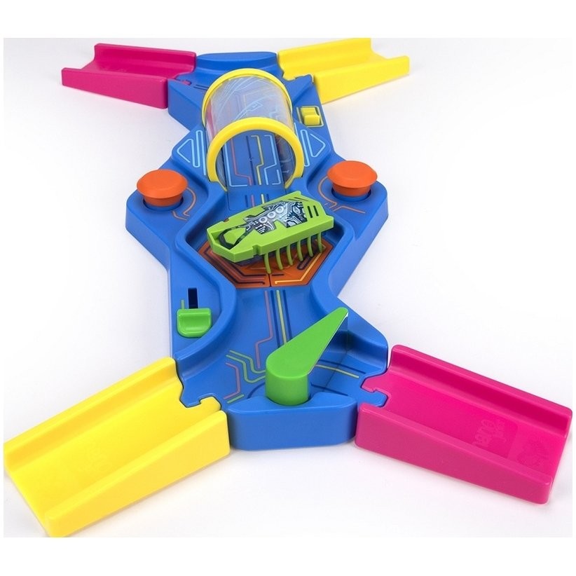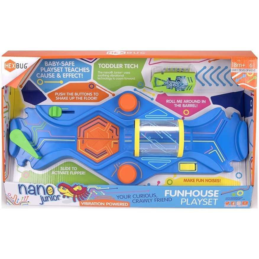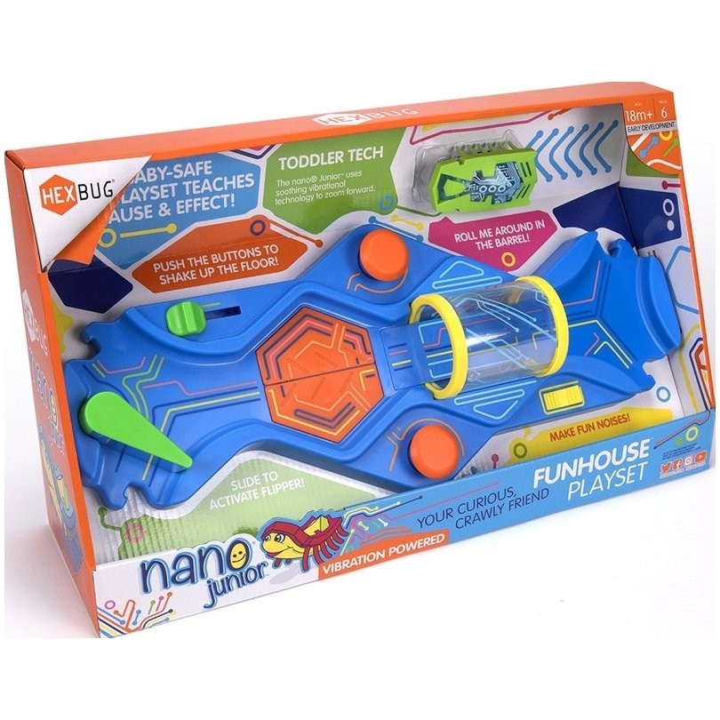 Vedd robotbarátodat a színes pályára! A pálya számos egyszerű interaktív elemet tartalmaz - forgó hordó, mozgó padló, kapcsoló és további rámpák. A készlet tartalmazza a Nano Junior bogarat, amely egy vibráló motornak köszönhetően a padlón fut, és játékosan szórakoztat minden gyermeket. Alkalmas játék 18 hónapos gyermekek számára. Akkumulátor (AG13) tartozék. A HEXBUG Nano Junior Fun House a CPSIA szabványoknak megfelelően készül.