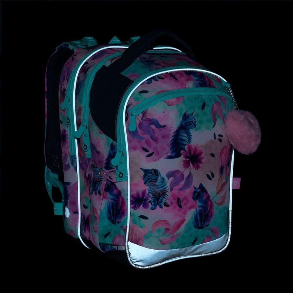 A hátizsák oldalán kulacstartó zsebek találhatók – például egy 0,5 literes kulacs is kényelmesen elfér bennük. Természetesen fényvisszaverő elemekkel is fel van szerelve, amelyek növelik a gyermek biztonságát az iskolába vezető úton. Az alsó rész megerősített és kopásálló, így a táska jól tartja formáját és ellenáll a mindennapi használatnak.