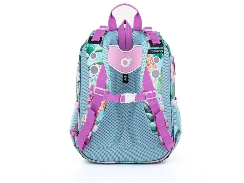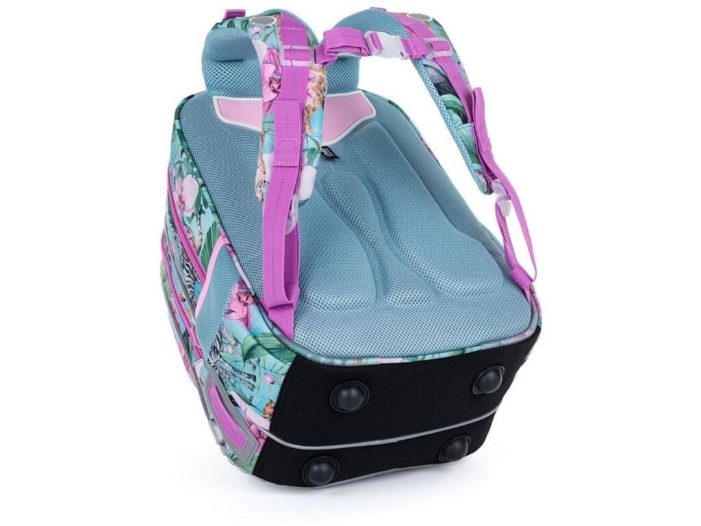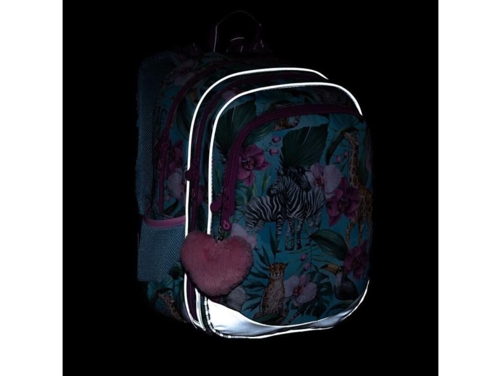 Türkiz hátizsák rózsaszín cipzárakkal, szafari állatmintákkal és plüss szív medállal. Az ELLY modell súlya nem éri el az egy kilogrammot, ezért ideális az általános iskola elsőtől negyedik osztályáig járó lányok számára. A hátizsák két tágas fő rekesszel rendelkezik. A hátsó rekesz nagyobb, és megbízhatóan elnyeli az összes tanszert. Az első rekesz valamivel keskenyebb, és egy kis cipzáras hálós zseb, valamint névcímke található benne. Az elülső mély zsebbe például belefér a PENN 23004 tolltartó azonos dizájnnal vagy egy uzsonnás doboz. Az oldalsó zsebekbe 0,5 literes palackok helyezhetők.