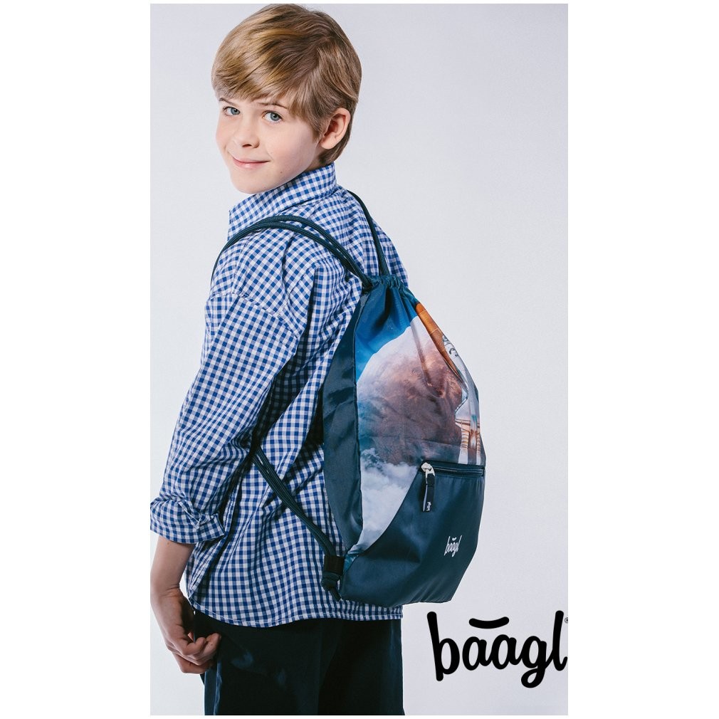 Baagl tornazsák cipők vagy egyéb apró tárgyak számára, amelyek alkalmasak a gyermekek szabadidős tevékenységére. Elülső cipzáras zsebbel rendelkezik. Erős és mosható anyagból készült. Erős fűzőkkel meghúzva, amelyek háton is hordhatók.Méret: 46 x 36 cm