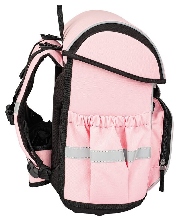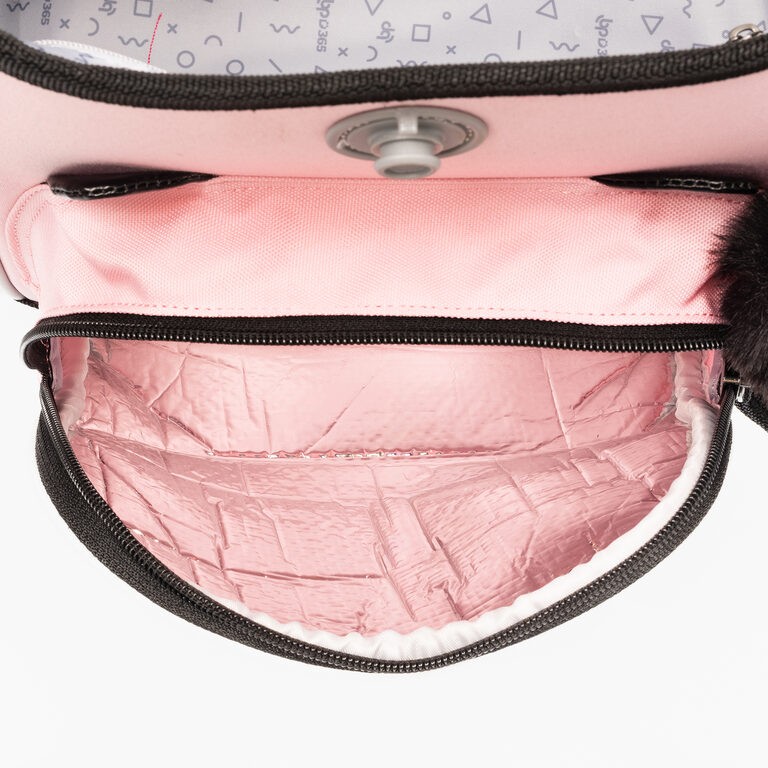 BELSŐ ELRENDEZÉS – a tágas fő rekesz textil elválasztóval van ellátva a füzet- vagy könyvtartó doboz számára. A fő rekesz része továbbá egy kisebb zseb apróságoknak, levehető kulcstartó karika, valamint név- és címke. A fedélben átlátszó zseb található az órarend számára. Az uzsonnás doboz zsebe részben hőszigetelt, hogy az étel hosszabb ideig megőrizze hőmérsékletét. A táska mindkét oldalán zsebek találhatók esernyő vagy kulacs számára. Az elhelyezésük és rugalmas szegélyük segít csökkenteni a folyadék kiömlésének és a táska tartalma károsodásának kockázatát.