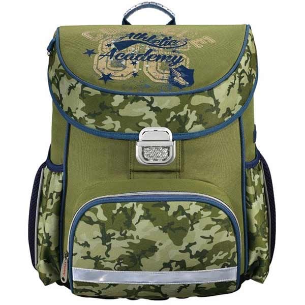 Egykamrás aktatáska, hadsereg motívummal. Az aktatáskának ergonómiailag alakú hátfala van puha párnázattal, párnázott, állítható vállpánttal, a vállpánt tetején levő varrással, nem vágja a vállakat. A hevedereket a fényvisszaverő felületek egészítik ki a nagyobb biztonság érdekében. A feszítő hevederek a hevederek tetején helyezkednek el, fontos, hogy a táska tökéletesen illeszkedjen a gyerek hátra. A magasságban állítható mellkasi őv segíti, hogy a vállpántok ne csússzanak le a gyerek vállról.