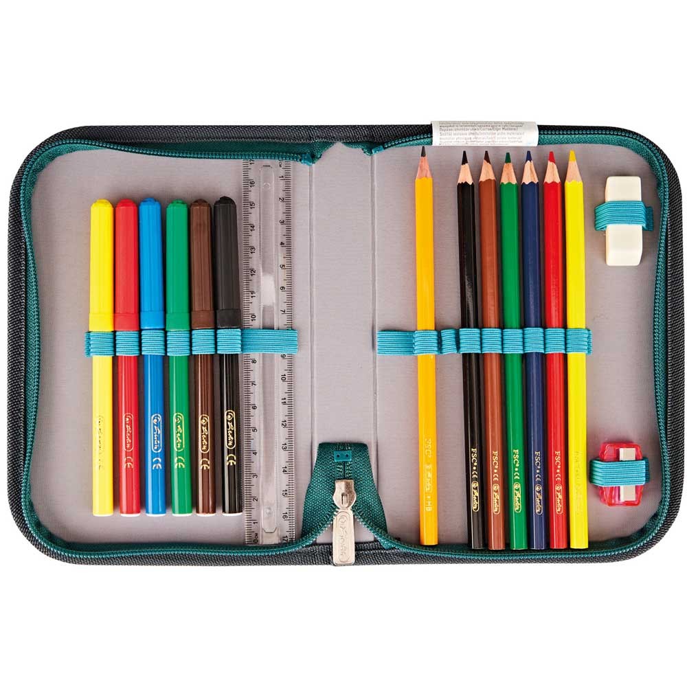 Egyszerű felszerelt iskolai tolltartó, amely tartalmaz 6 filctollat, 1 vonalzót, 1 tollat. 6 ceruzát, 1 radírgumit és 1 faragót.