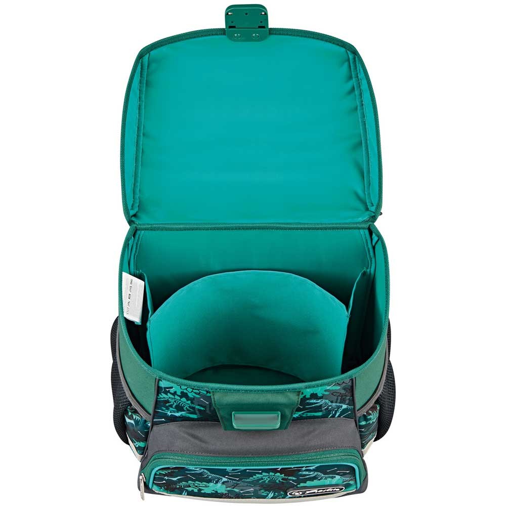 Az egykamrás iskolatáska kedvenc dinós mintával alkalmas az apró fiúknak. Nagy előnye ezeknek az iskolatáskáknak, hogy könnyűek. A légáteresztő hátsó rész ergonomikus formázott párnázással biztosítja viselés közben a magas komfortérzetet. Magassághoz állítható, anatómiailag formázott vállpántok szolgálnak a táska helyes elhelyezhetőségéért a háton. Az integrált mellkaspánt segítségül szolgál, hogy a táska ne csúszkáljon a vállakon. A belső része textil elválasztóval van elválasztva a füzetek és a könyvek stabil elhelyezése miatt. Az oldalsó zseb részben hálós anyagból készült, ezért tartható benne egy 0,5l- es italos üveg is. Az első cipzáras zseb ideális a tízórais doboznak. A gyermek biztonságának növelése érdekében ködben, vagy kedvezőtlen időjárási körülmények esetén az iskolatáska minden oldala fényvisszaverő elemekkel van ellátva.