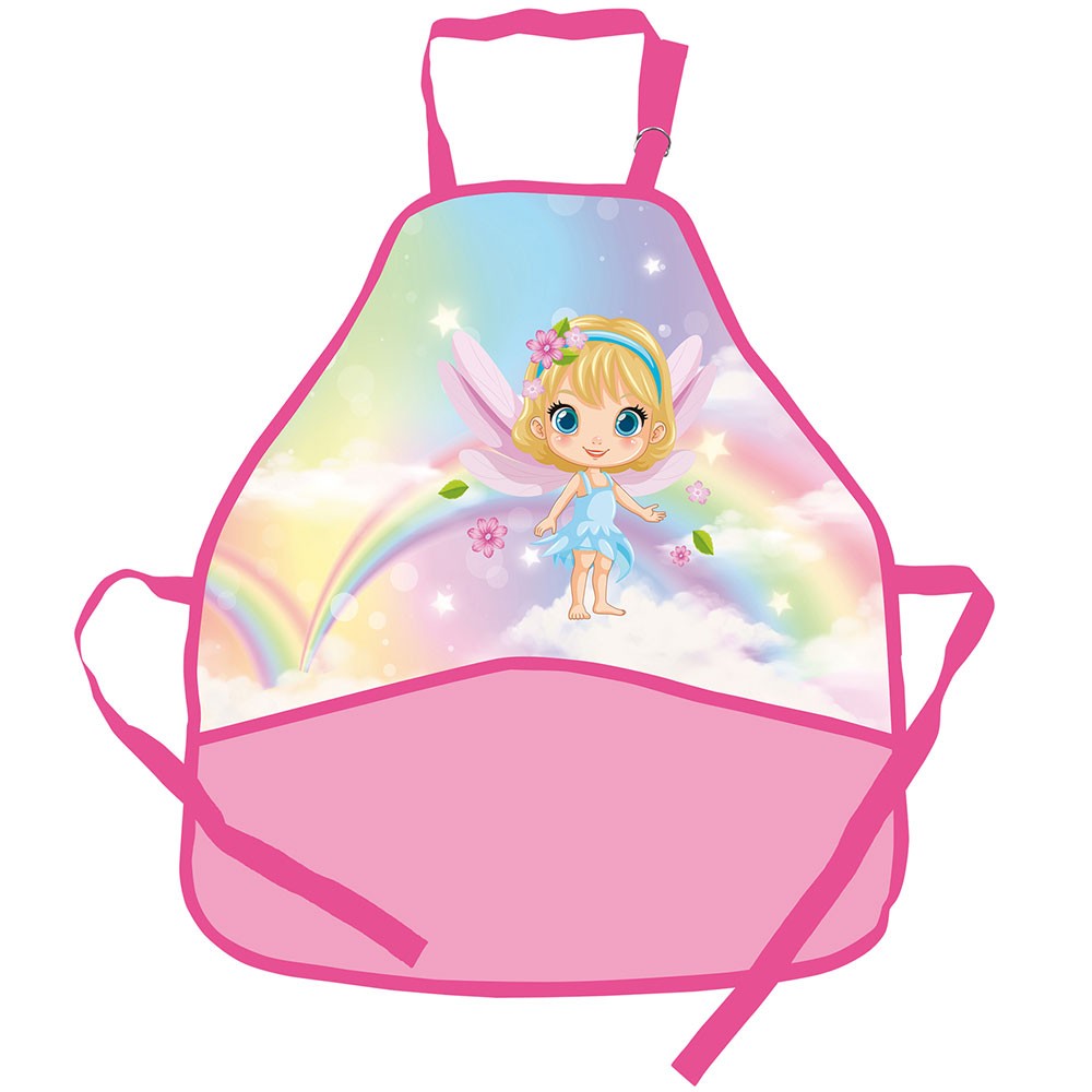 Állítható pánttal veszi fel a fejére, és zsinórral köti a test köré. Mosható poliészter anyagból készült, amely könnyen karbantartható. Az elején 2 zseb található a művészeti kellékek számára.